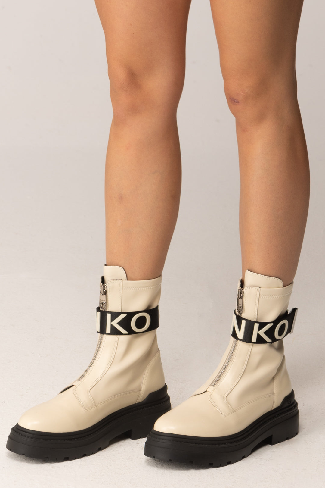 Styl urban z nowoczesnym dodatkiem: te stivellti Pinko wykonane są ze skóry stretch z gumową podeszwą w kontrastowym kolorze, a ich cechą charakterystyczną jest przednie zapięcie na metalowy zamek błyskawiczny, na którym nakłada się taśma z logo marki.