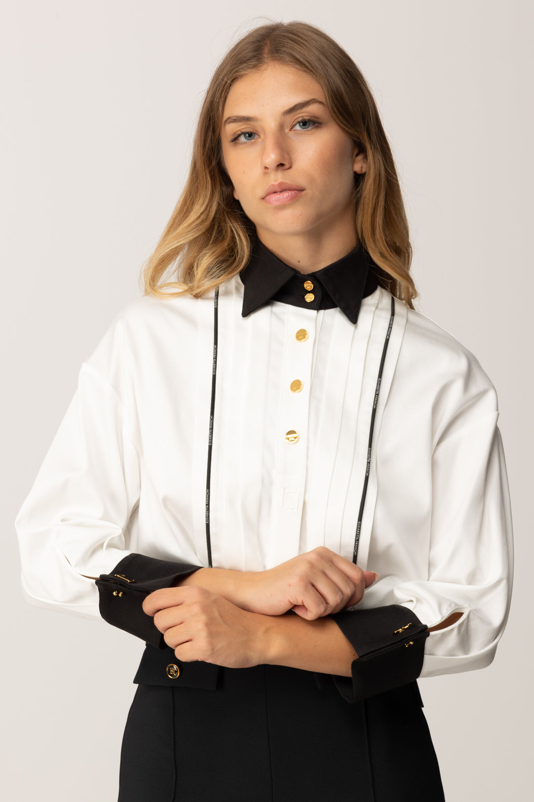 Klejnot elegancji w nowoczesnym wydaniu, ta camicia Elisabetta Franchi podoba nam się za mieszankę inspiracji, które wzbogacają ją o detale nadające każdemu lookowi wyjątkowy charakter. Krótki i szeroki krój w talii, design gra przede wszystkim kontrastami kolorystycznymi dzięki mankietom, kołnierzykowi i lamówce towarzyszącej plisowaniu z przodu, a także rozświetla się złotymi akcentami dzięki metalowym detalom. Oryginalna i wyszukana, bardzo modna także dzięki nawiązaniom do tematu smokingu typowego dla tej kolekcji.