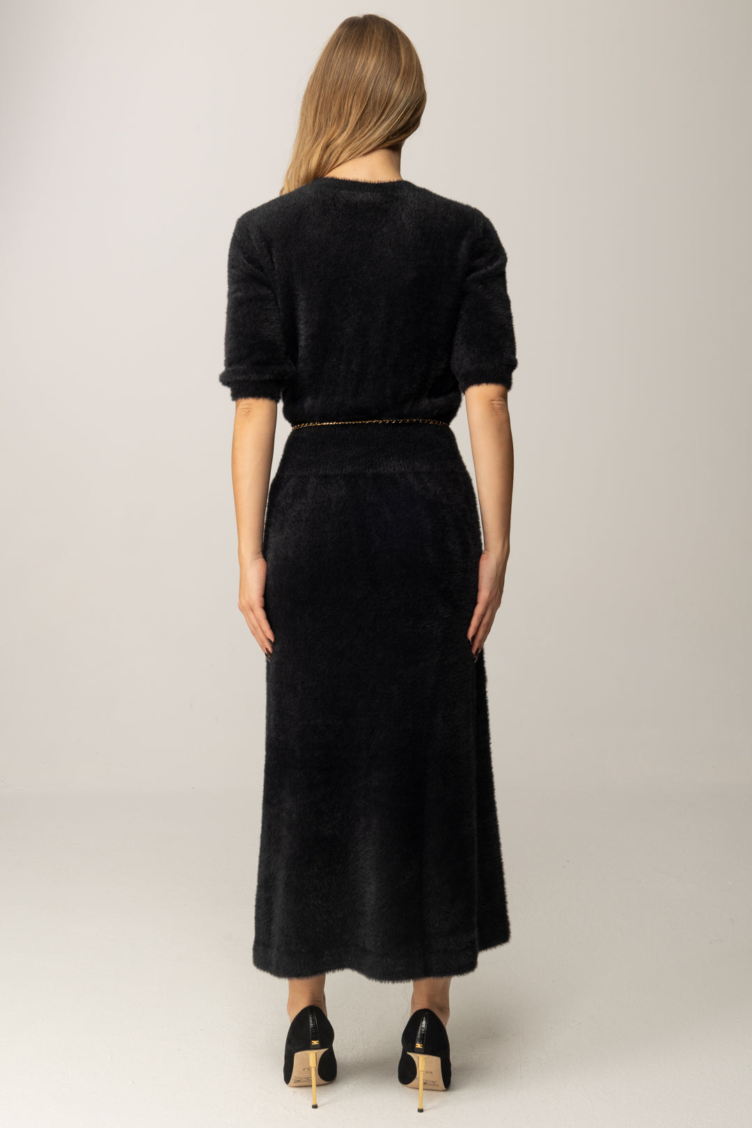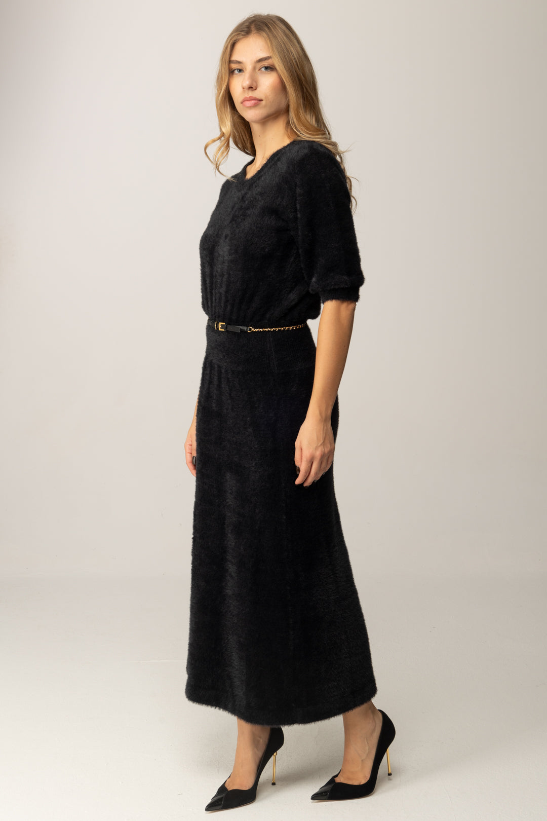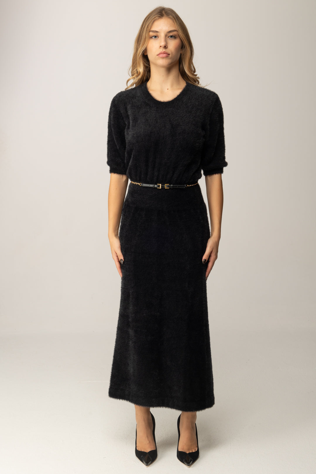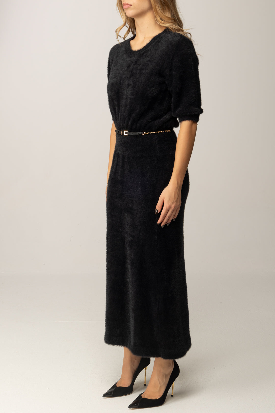 Kreacja zaprojektowana, by być wyrafinowana bez wysiłku: ta abito in maglia Elisabetta Franchi wykonana jest z miękkiej tkaniny o efekcie futerka, która podąża za sylwetką, z wbudowanym paskiem z złotą klamrą delikatnie podkreślającą talię. Linearność midi pozostawia miejsce na drobne detale mówiące o luksusie: staranne wykończenia, zrównoważony układ, proporcje zaprojektowane, by podkreślić. Idealna jako wyrafinowana sukienka dzienna lub elegancka baza na wieczory bez formalnych wymagań. Subtelny dekolt typu crew neck i rękawy do łokcia dopełniają całość.