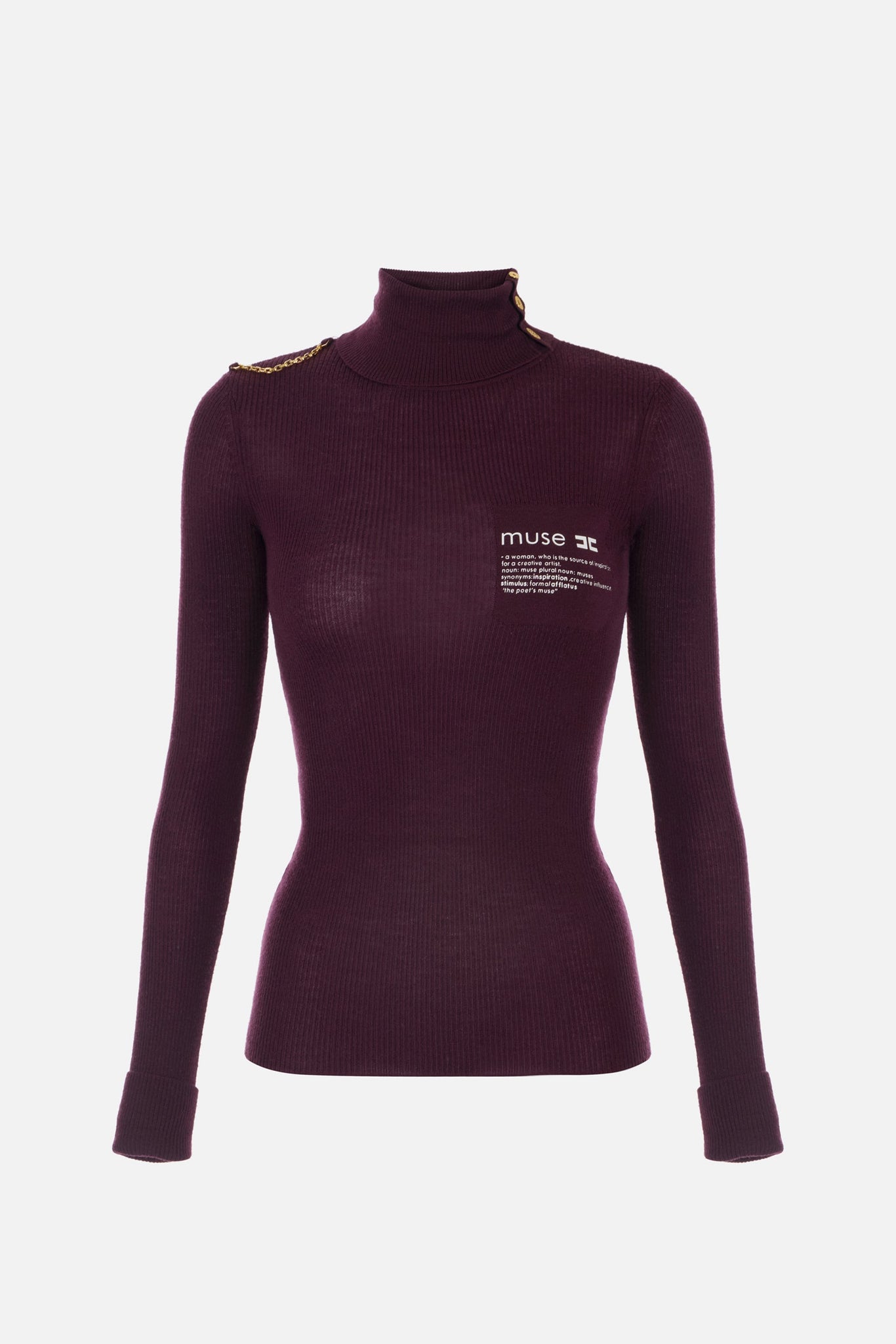 Element niezbędny, który staje się ikoniczny dzięki dodaniu nadruku inspiracyjnego: maglia dolcevita Elisabetta Franchi, który podkreśla sylwetkę dzięki dopasowanemu krojowi, uzupełnionemu wysokim kołnierzem otwartym z boku dzięki guzikom z metalowym złotym logo. Z przodu nadruk wyraża stylowy przekaz, podczas gdy uroczy łańcuszek biżuteryjny na ramieniu odbija światło z dyskretną elegancją.