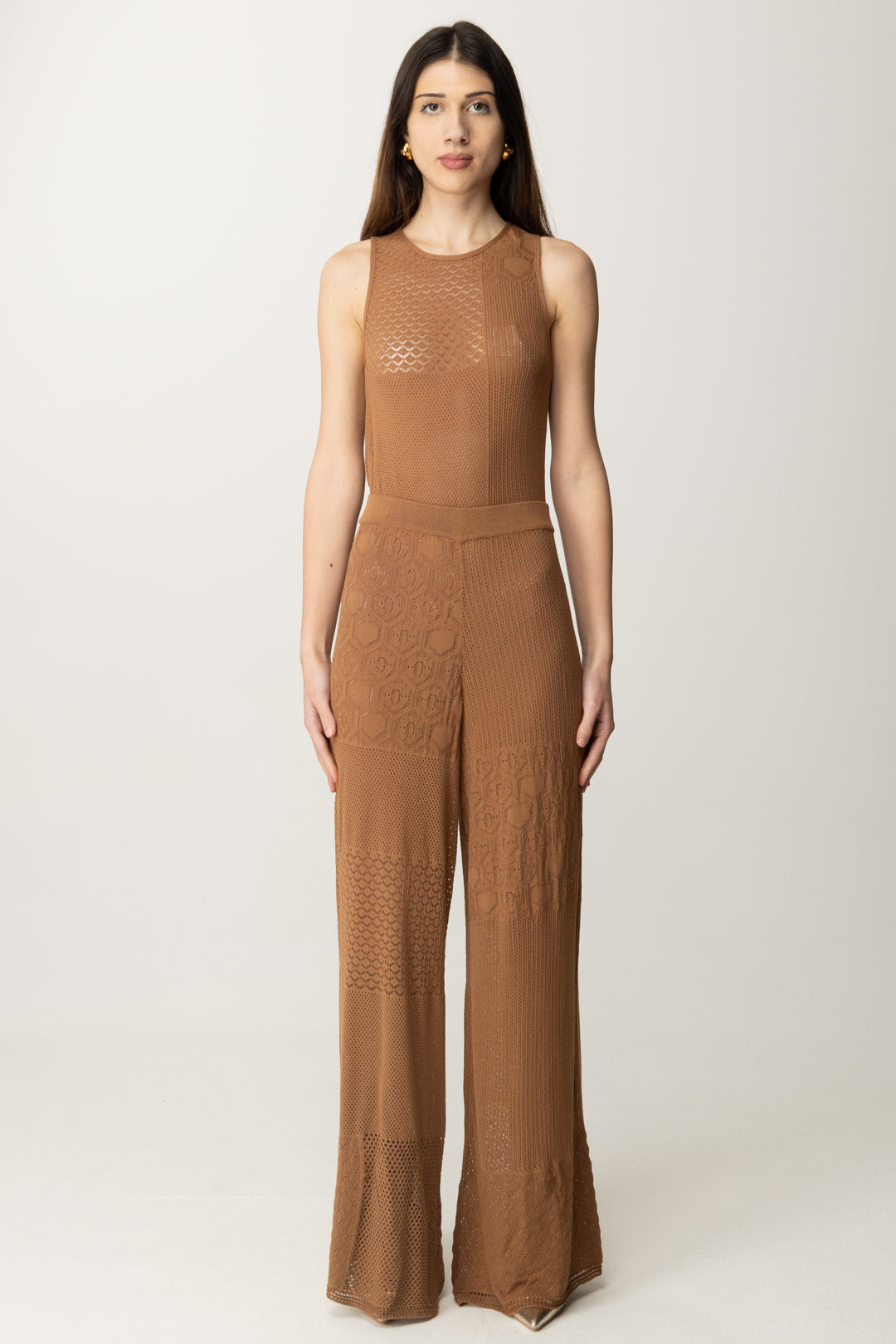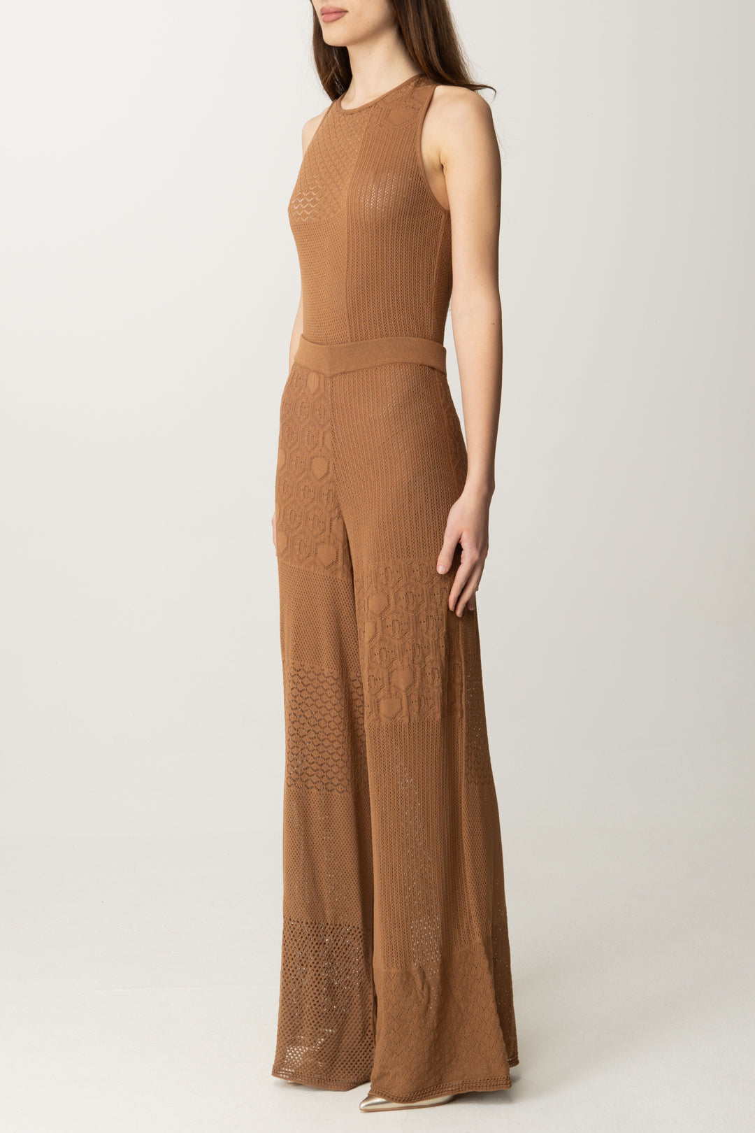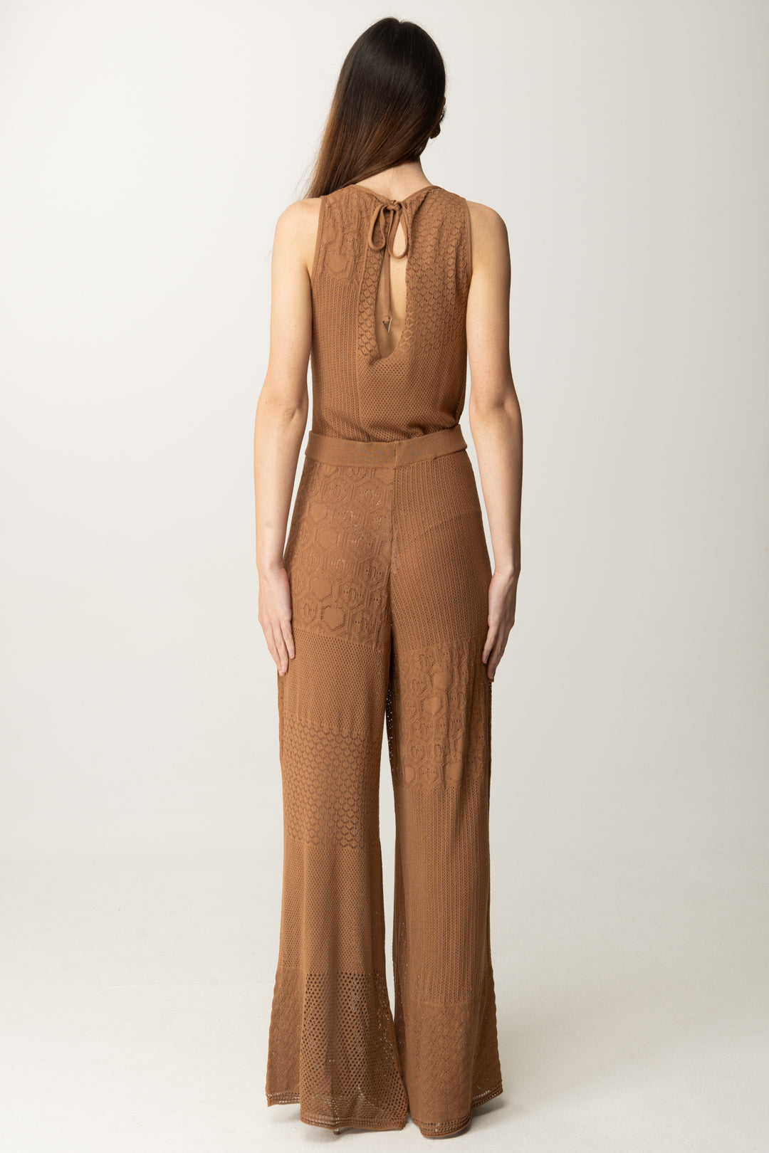 Tuta Akep smanicata dal design patchwork in maglia traforata e lavorazioni geometriche. Effetto seconda pelle con un tocco boho-chic. Perfetta con sandali nude e orecchini statement per un look sofisticato ma rilassato.