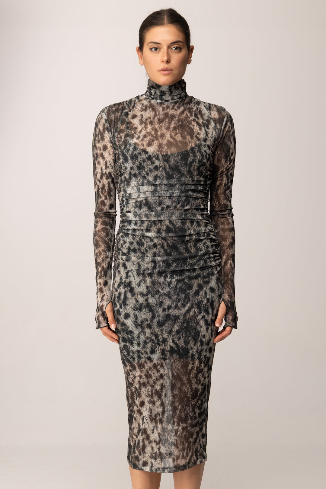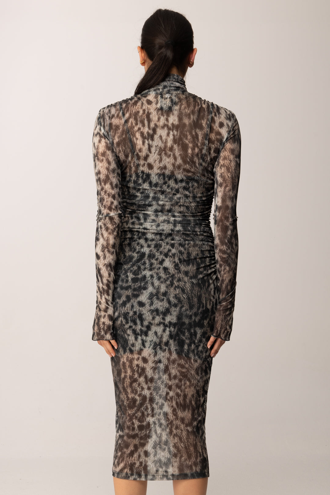 Un abito lungo Aniye By dallo spirito audace e raffinato, pensato per una donna che desidera esprimere personalità con eleganza. Il tessuto stretch aderente valorizza i volumi con un fit affascinante ma comodo, mentre la stampa animalier all-over si mescola con pieghe drappeggiate che movimentano il design e accentuano la silhouette in modo grafico e moderno. Il collo alto e le maniche lunghe bilanciano la vibrazione wild della fantasia, rendendo il capo perfetto anche in contesti formali dove non si rinuncia ad un dettaglio forte.