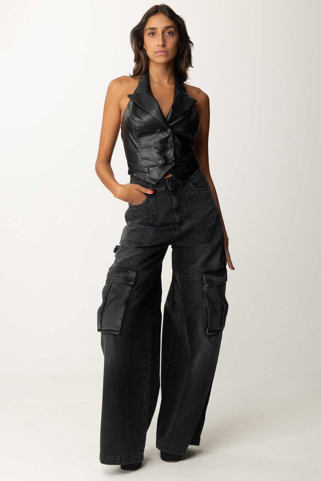 Un gilet Aniyeby aderente e sensuale, realizzato in ecopelle stretch e caratterizzato dalla schiena scoperta che dona un tocco di originalità e raffinatezza. Perfetto per chi desidera un look ricercato e d'impatto.