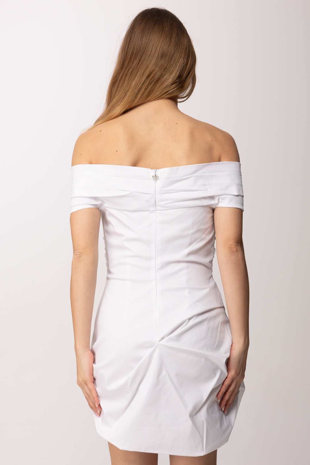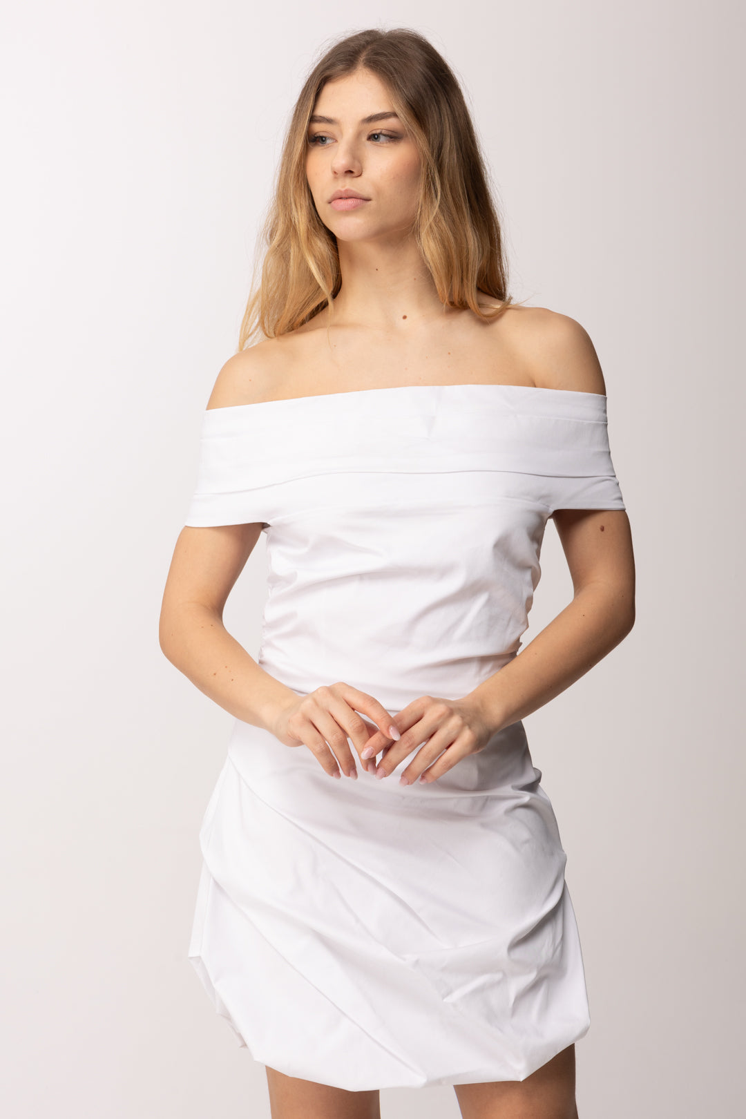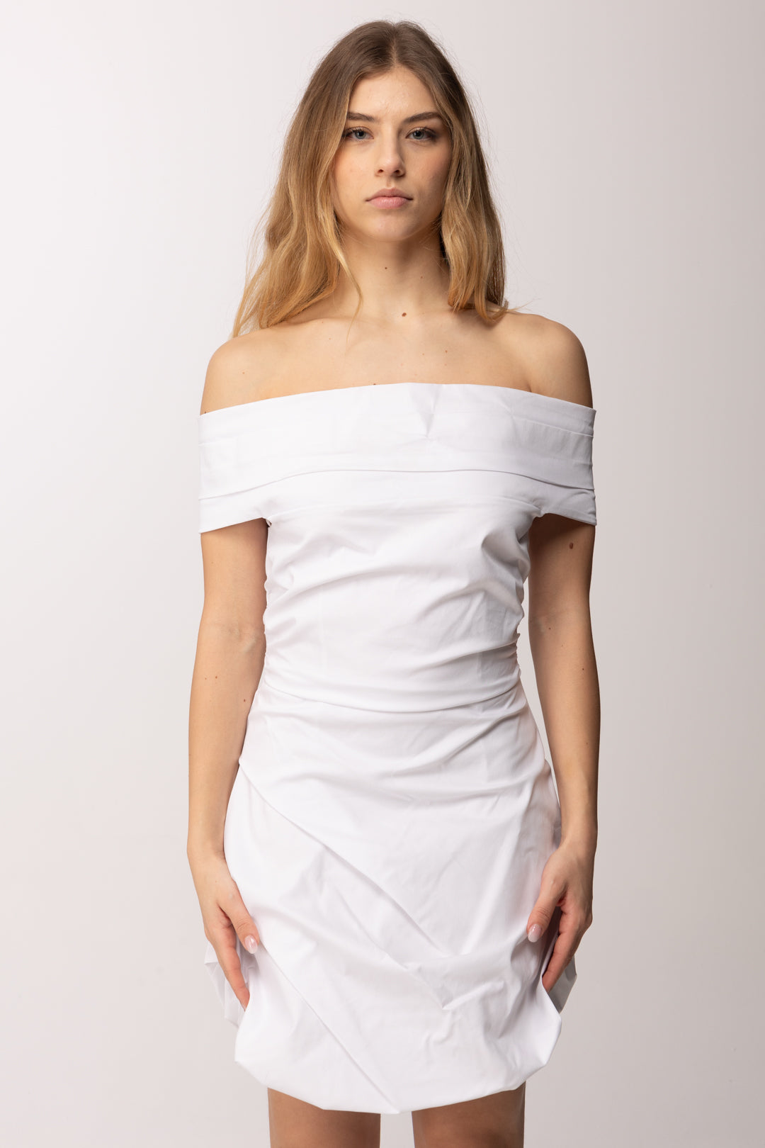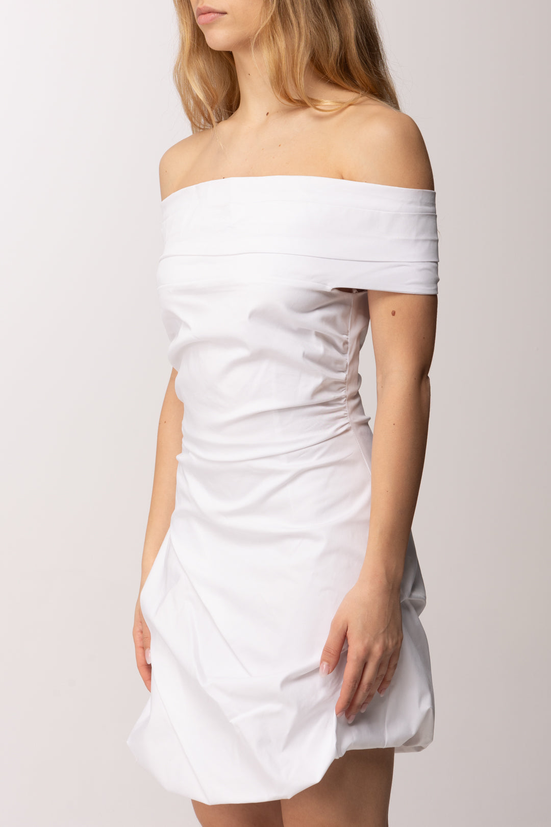 Scollatura off-shoulder, candido e abbagliante: un mini abito Aniye By da godersi tanto ad abbronzatura accennata, tanto con la pelle ambrata, per un contrasto col bianco che si apprezza sempre in estate. La particolarità della gonna, leggermente balloon, è compensata dal busto aderente, con piccole arricciature ai fianchi, e dalla scollatura lienare, che fascia il petto e le braccia.