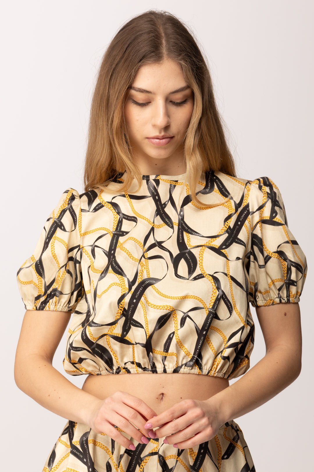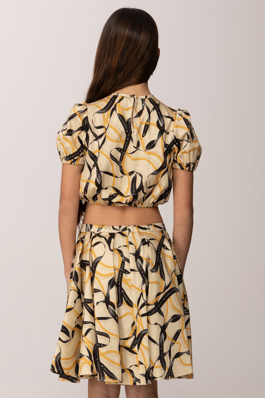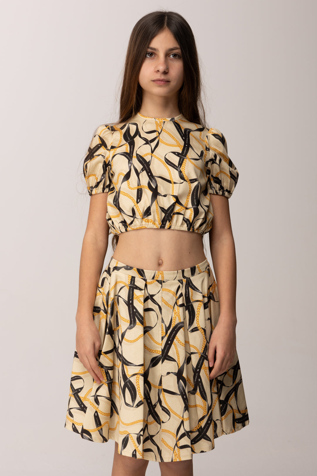 Questa casacca crop della linea Elisabetta Franchi La Mia Bambina interpreta in chiave mini il mondo iconico del brand, attraverso una stampa a nastri intrecciati che richiama catene e ribbon grafici dal gusto sofisticato. La linea è corta e leggermente arricciata sul fondo, con elastico interno che valorizza la silhouette e assicura una vestibilità confortevole. Le maniche corte a sbuffo aggiungono un tocco romantico e strutturato, bilanciando la grafica decisa della stampa con una nota più delicata. Il girocollo pulito mantiene l’equilibrio formale, rendendo la casacca adatta sia a occasioni speciali che a momenti più casual ma curati.