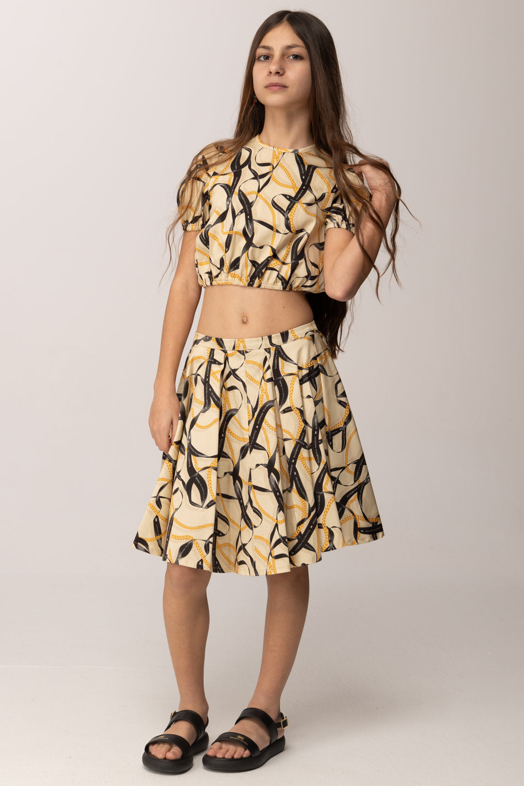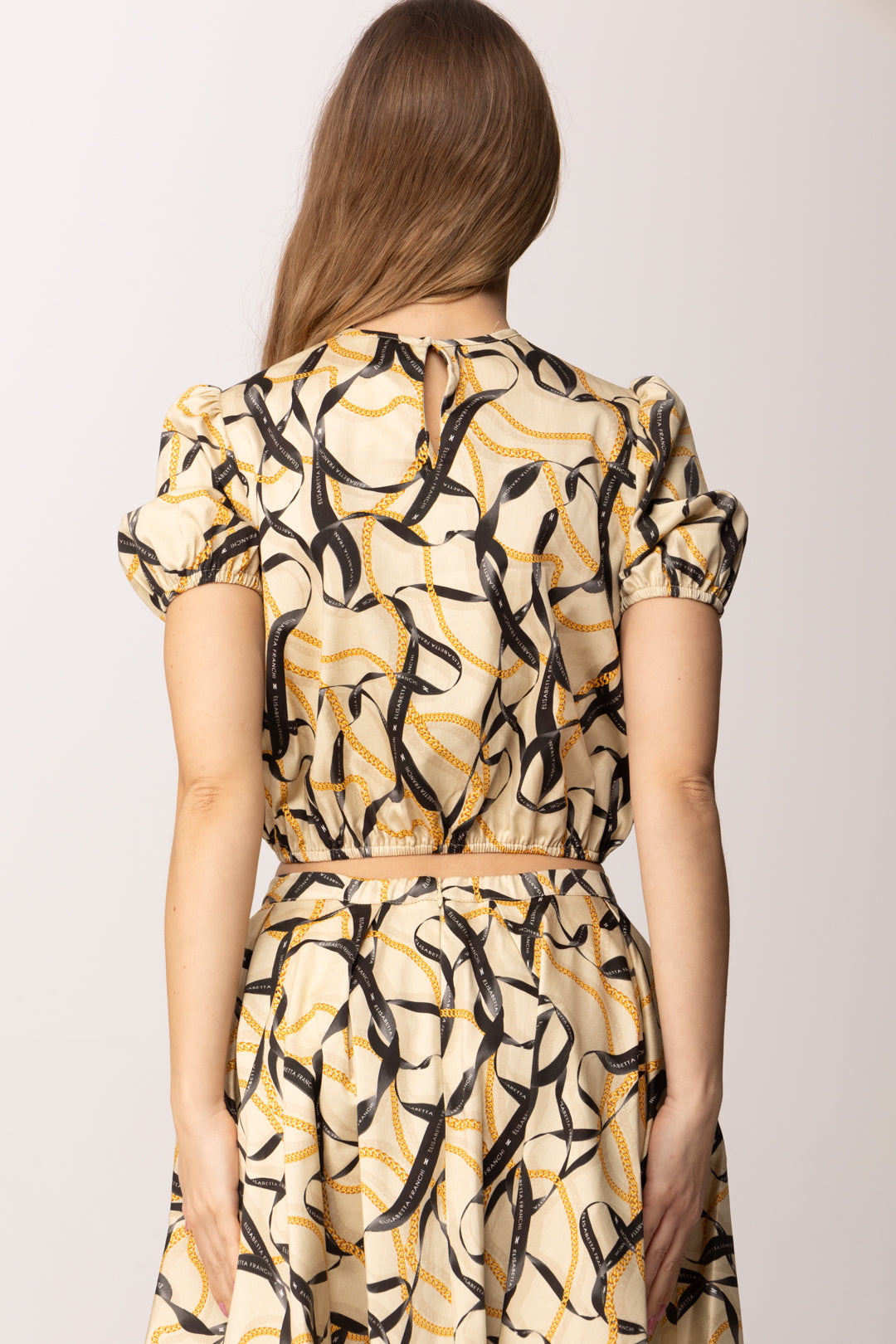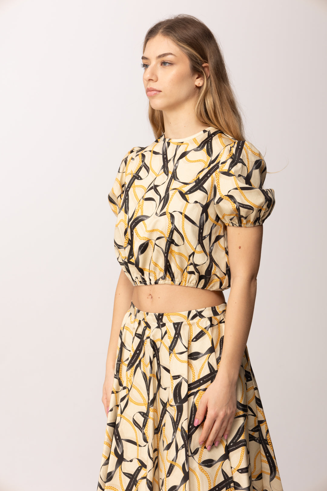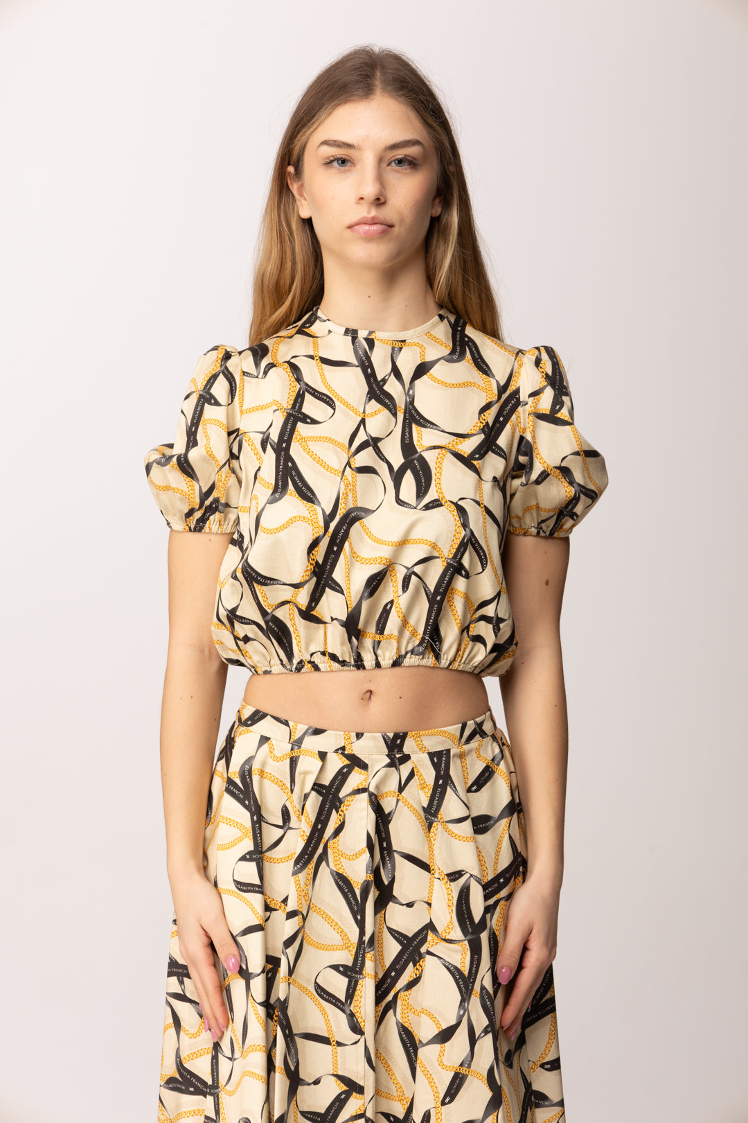 Questa casacca crop della linea Elisabetta Franchi La Mia Bambina interpreta in chiave mini il mondo iconico del brand, attraverso una stampa a nastri intrecciati che richiama catene e ribbon grafici dal gusto sofisticato. La linea è corta e leggermente arricciata sul fondo, con elastico interno che valorizza la silhouette e assicura una vestibilità confortevole. Le maniche corte a sbuffo aggiungono un tocco romantico e strutturato, bilanciando la grafica decisa della stampa con una nota più delicata. Il girocollo pulito mantiene l’equilibrio formale, rendendo la casacca adatta sia a occasioni speciali che a momenti più casual ma curati.