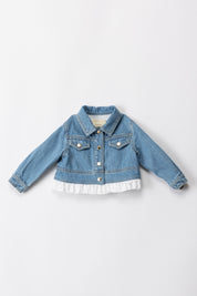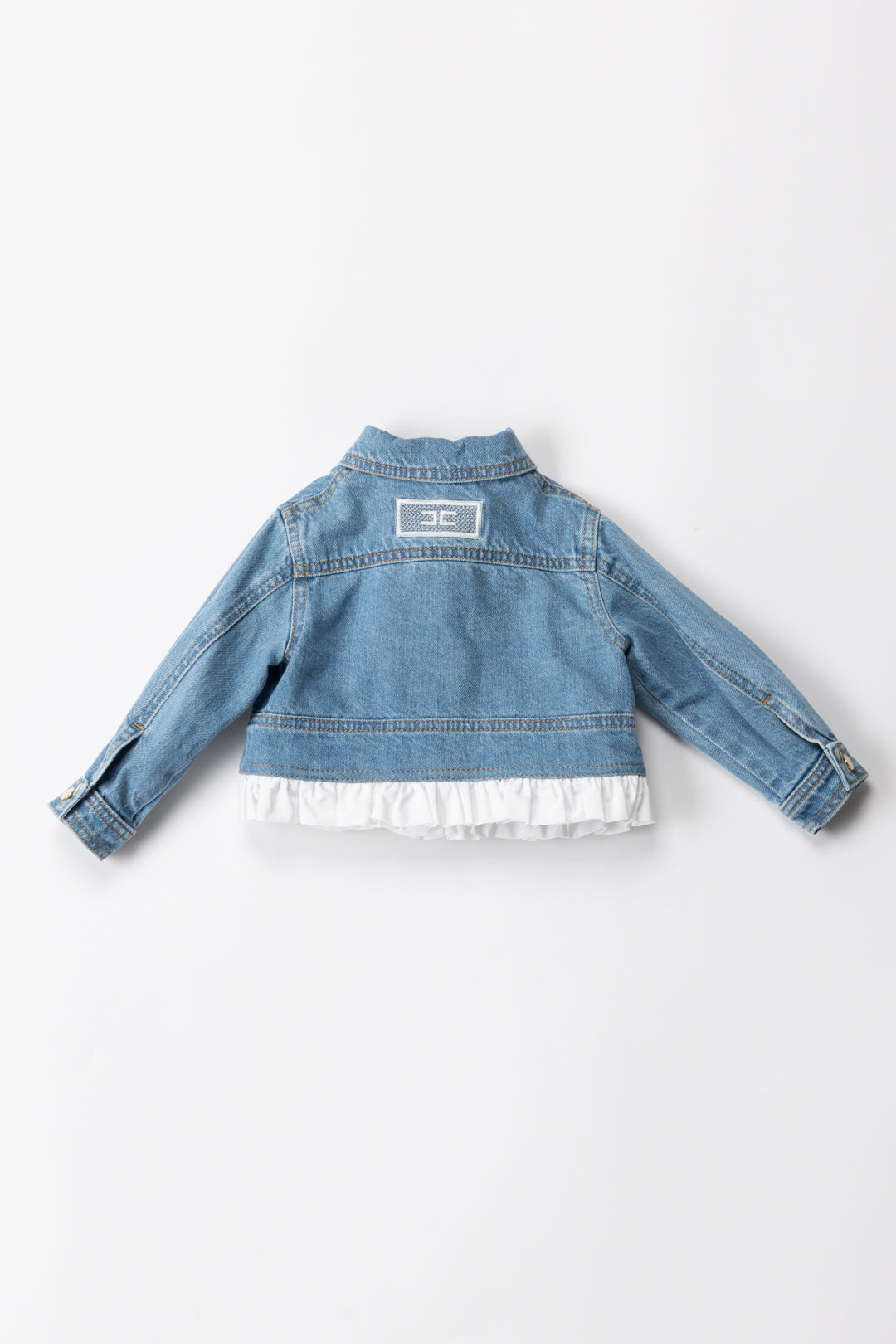 Un Giubbotto Elisabetta Franchi La Mia Bambina in denim arricchito da rouches in taffetà per un tocco glamour. Perfetto per aggiungere carattere a qualsiasi outfit, da abbinare a leggings o un vestitino.