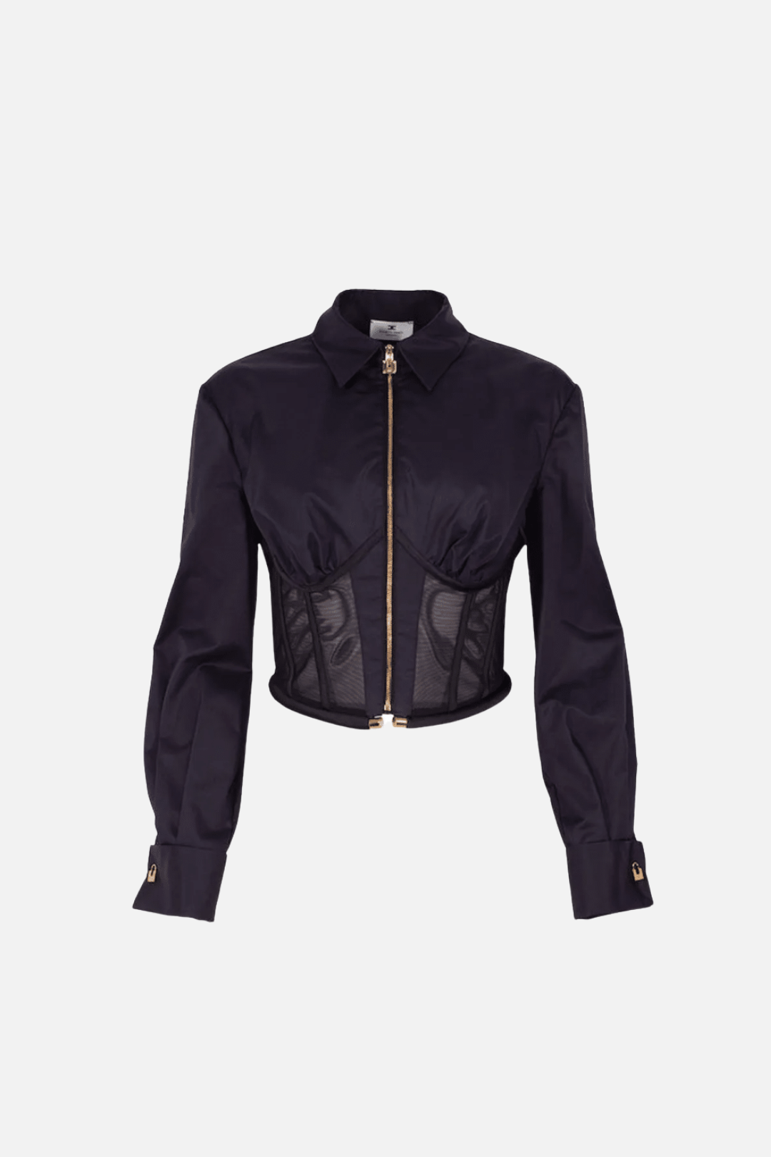 Il design si distingue per il bustier integrato con inserti trasparenti, che modellano il punto vita e valorizzano il décolleté con equilibrio e sensualità. La zip frontale in metallo dorato diventa un elemento grafico centrale, mentre il colletto classico e le maniche lunghe con polsini strutturati mantengono un dialogo costante con il mondo della camiceria tradizionale, reinterpretata in chiave fashion.
