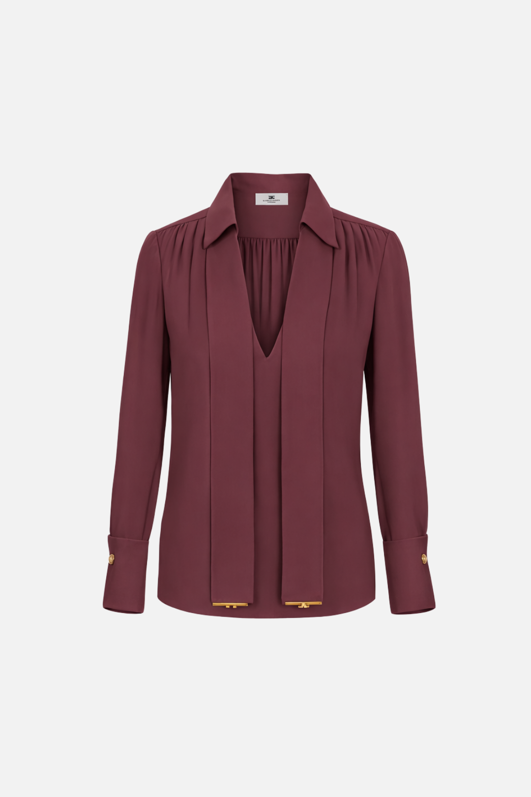 Il design è caratterizzato da uno scollo a V delicato che valorizza il décolleté senza eccessi, mentre la cintura coordinata annodata in vita permette di modulare la vestibilità, sottolineando il punto vita e creando una linea armoniosa. Le maniche lunghe con polsino definito aggiungono un tocco ordinato e rendono la camicia adatta anche a contesti più formali o professionali.