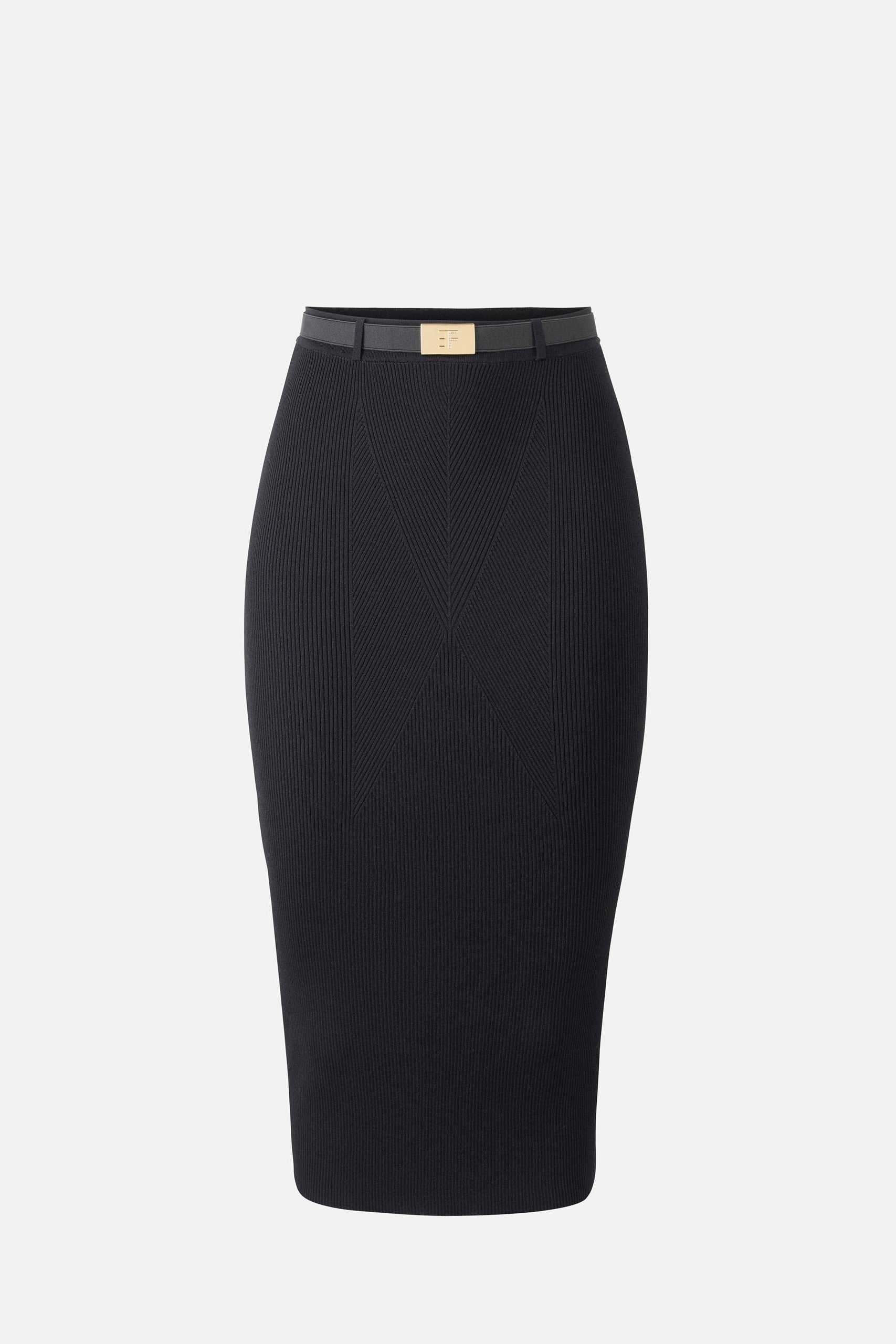 Un'elegante gonna in maglia firmata Elisabetta Franchi, pensata per valorizzare con stile e carattere la silhouette femminile. La lavorazione a costine, dal taglio geometrico, segue con precisione le forme del corpo, esaltando il punto vita e le linee con una raffinatezza discreta ma incisiva.Il dettaglio che cattura lo sguardo? La cintura tono su tono impreziosita dal logo gioiello in metallo dorato e strass, un elemento funzionale e decorativo che aggiunge luce e sottolinea il punto vita con decisione. L’effetto complessivo è di un capo versatile e di grande impatto, che coniuga sensualità e rigore stilistico.