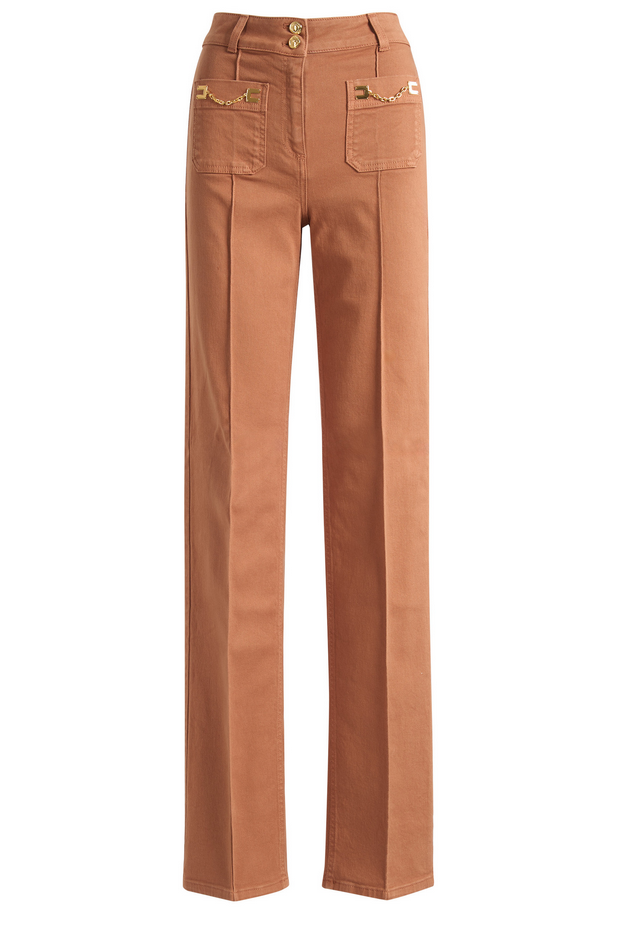 jeans Elisabetta Franchi realizzati in denim dal carattere deciso e raffinato, pensati per valorizzare la silhouette con una linea pulita e femminile. La vita alta struttura il punto vita con precisione, mentre la gamba aderente accompagna le forme e si apre con naturalezza verso il fondo, creando un equilibrio elegante tra comfort e slancio visivo.