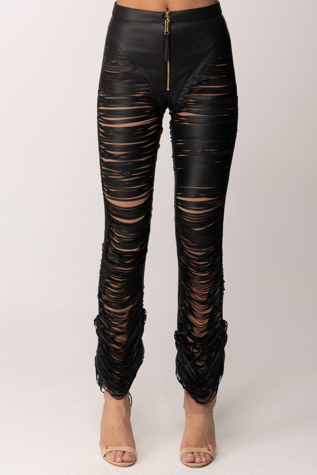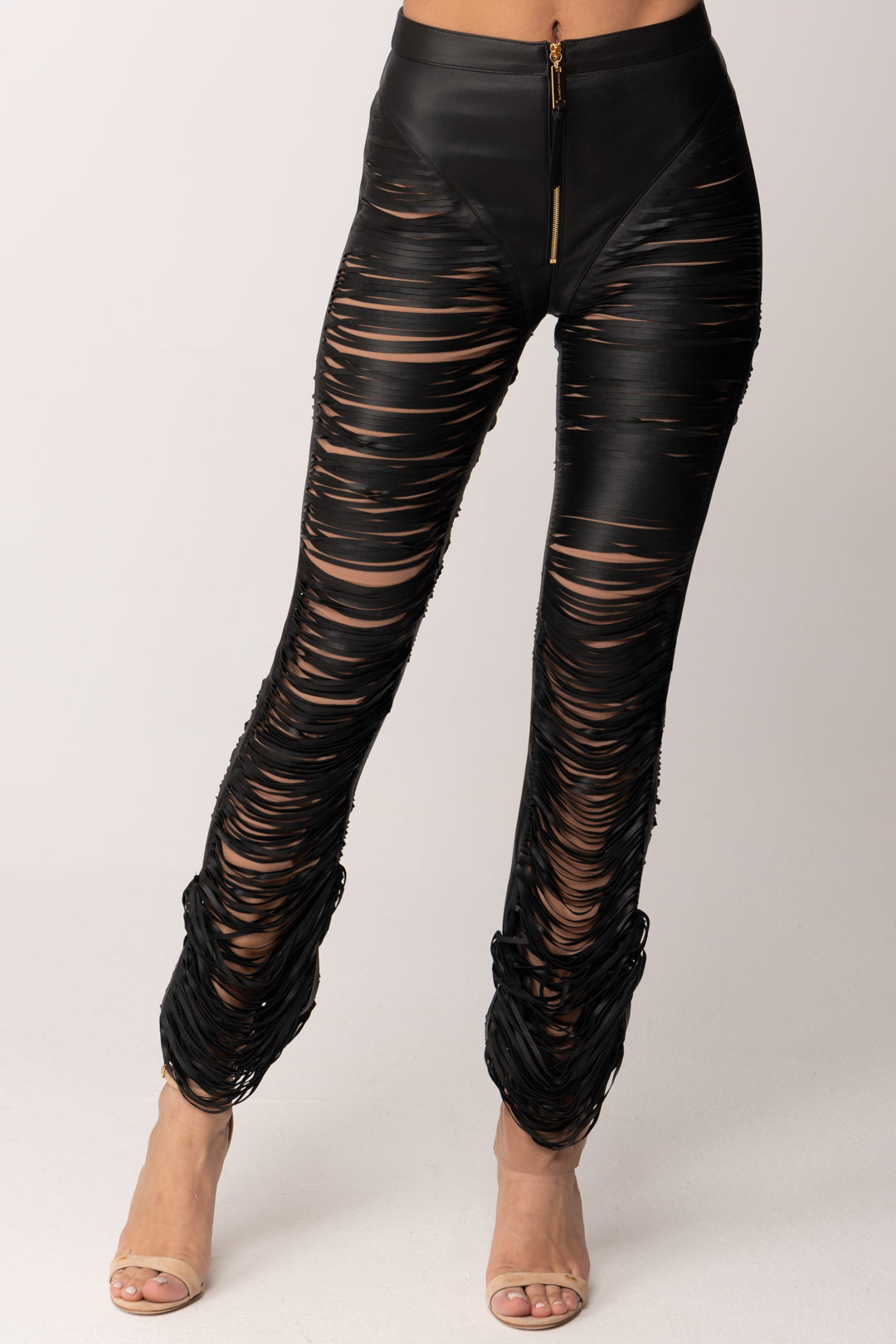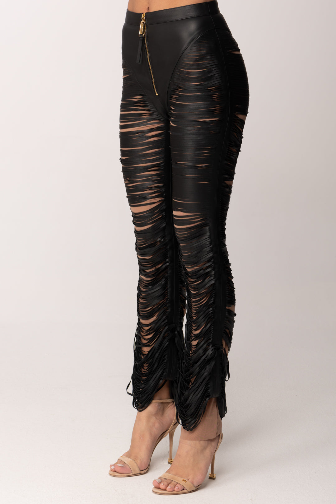 Il dettaglio distintivo è la texture composta da tagli orizzontali che trattengono sottili frange di pelle, creando un effetto tridimensionale ricco di movimento. Questa lavorazione genera giochi di volume e profondità lungo tutta la gamba, lasciando intravedere la pelle e rendendo il design dinamico e sorprendente. Il risultato è un capo che unisce artigianalità e spirito rock, mantenendo al tempo stesso una linea elegante e strutturata.