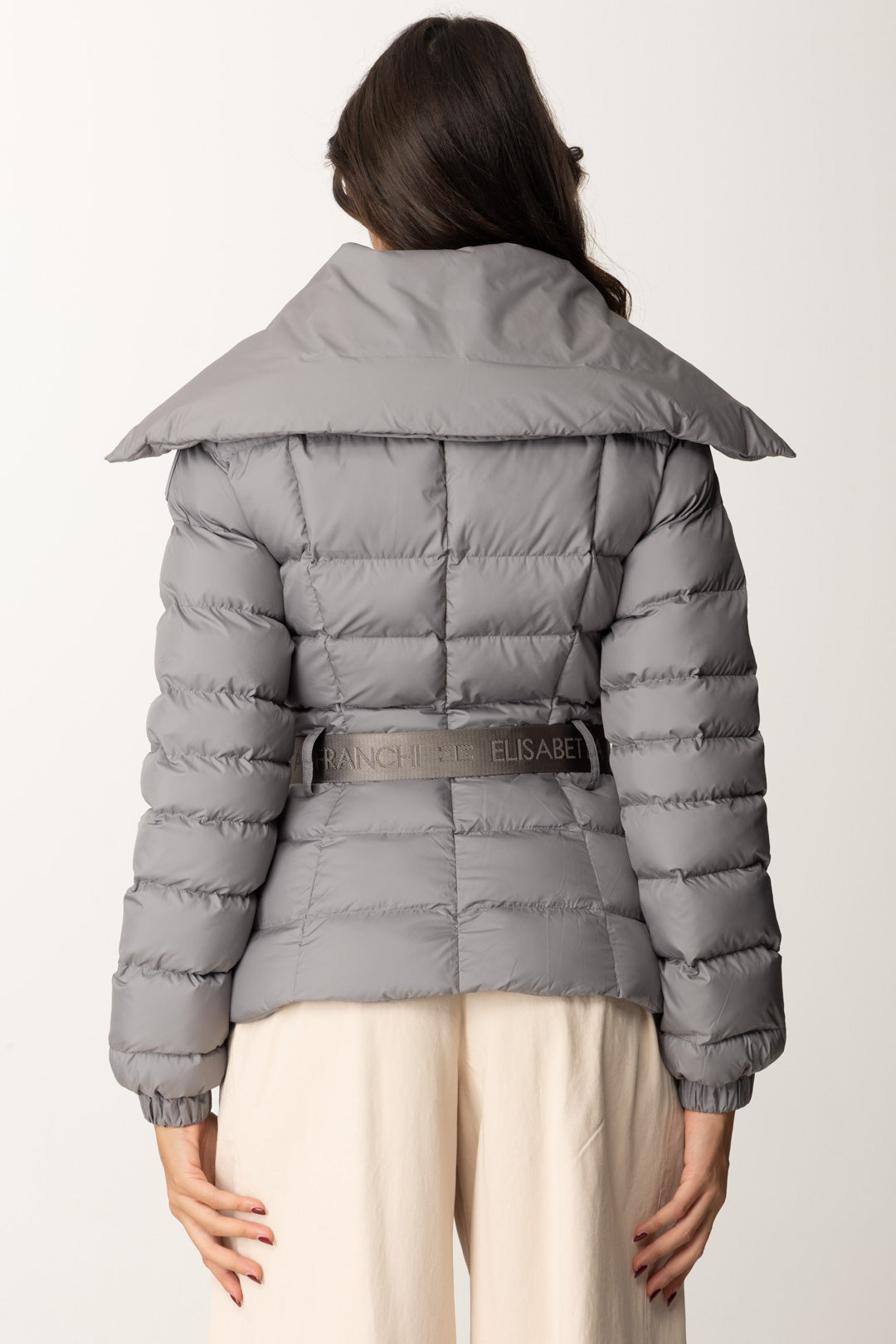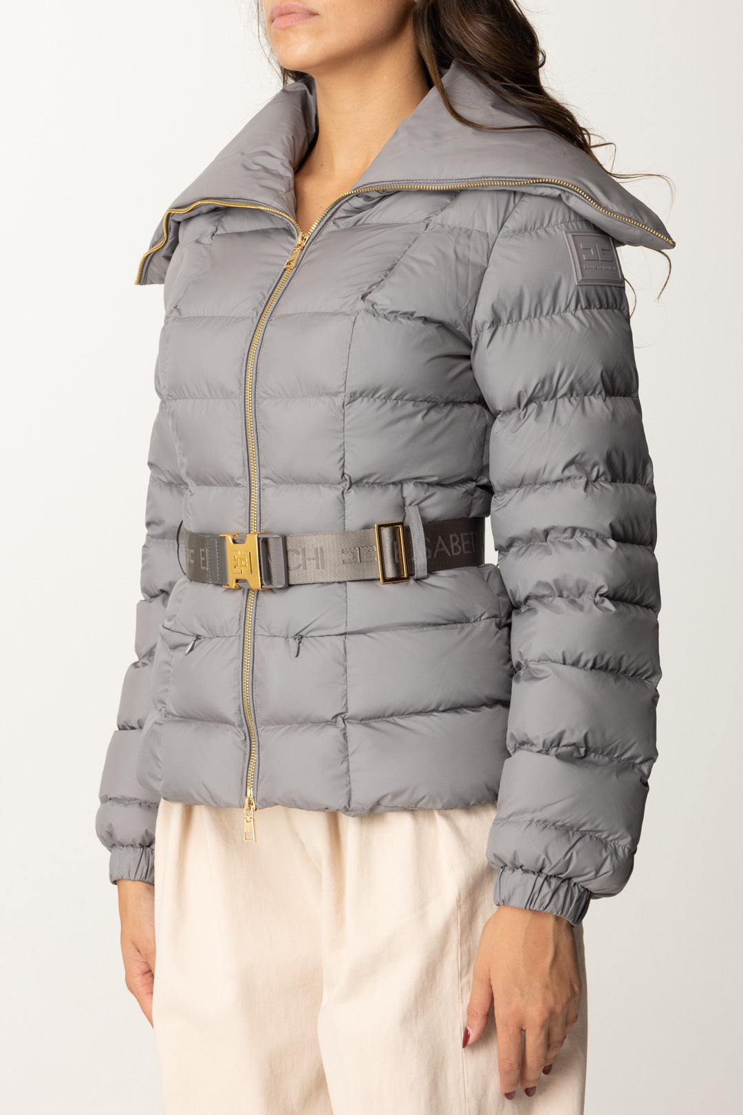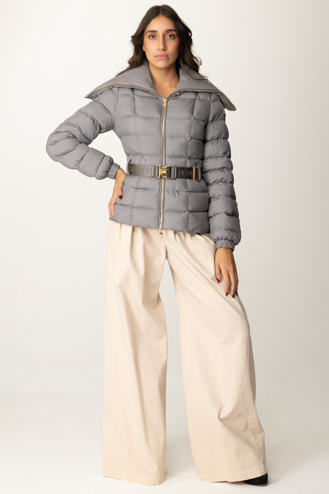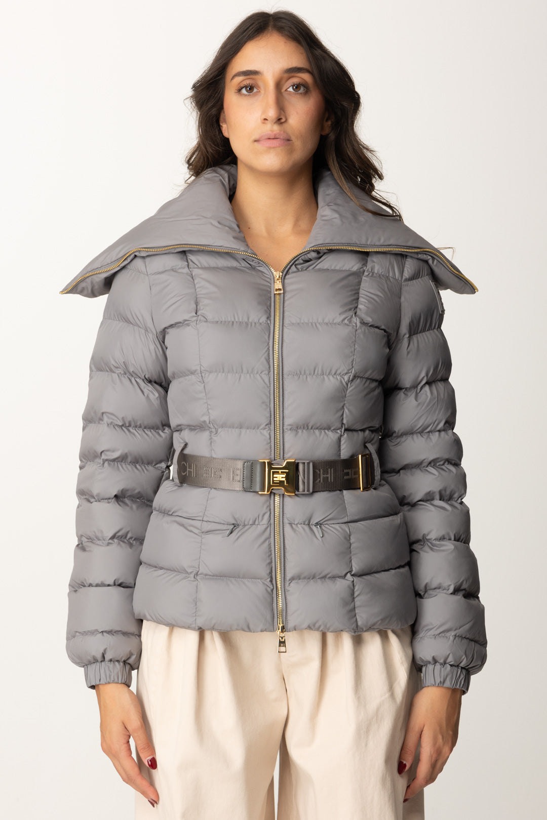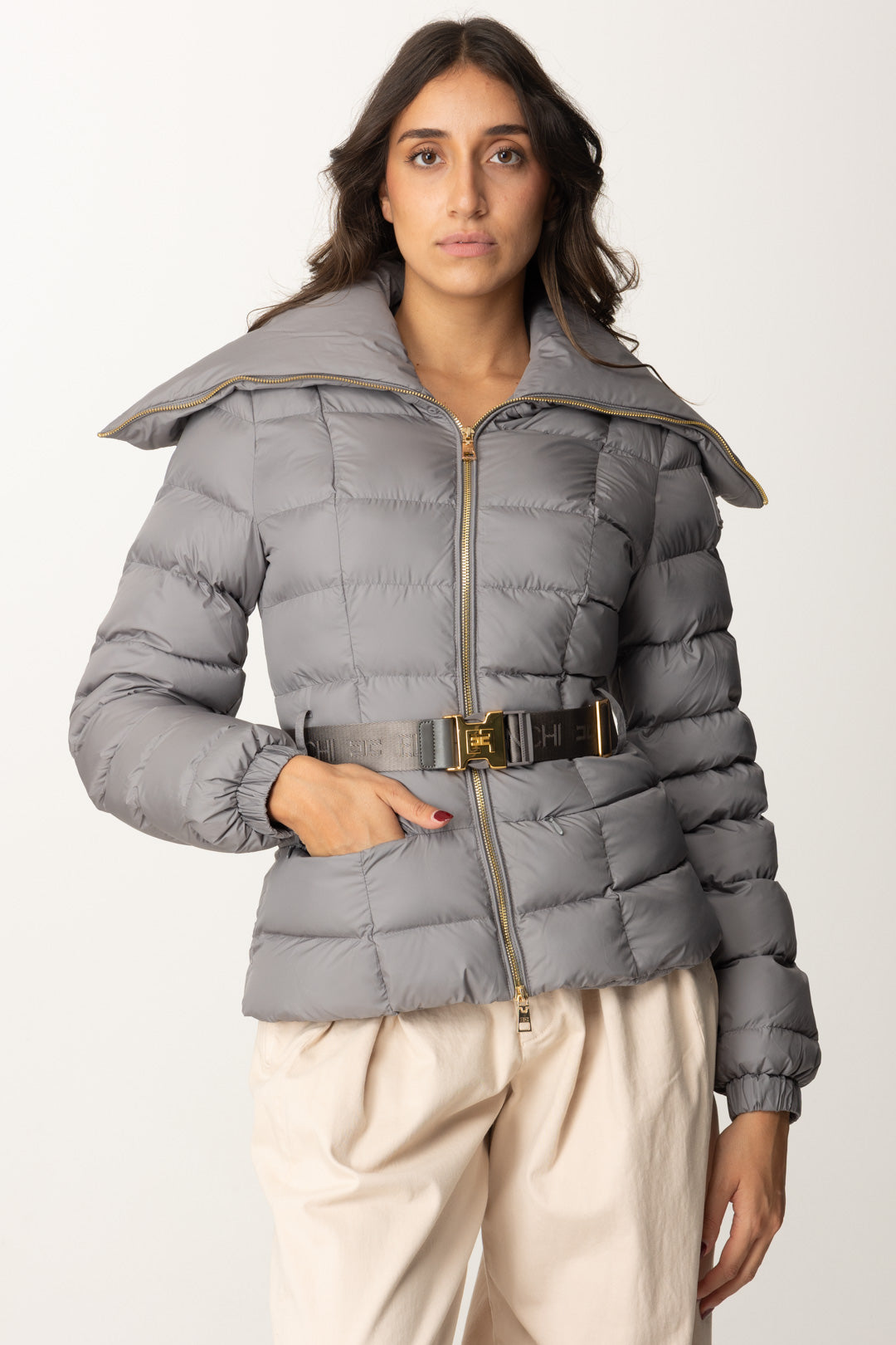 Piumino Elisabetta Franchi molto semplice e classy, caratterizzato da maxi collo, che poggia sulle spalle, e una cintura logata al punto vita perfetta per enfatizzare la silhouette in ogni tuo "strato". Cosa non può mandare? Il logo della maison, presente sulla spalla come etichetta gommata.