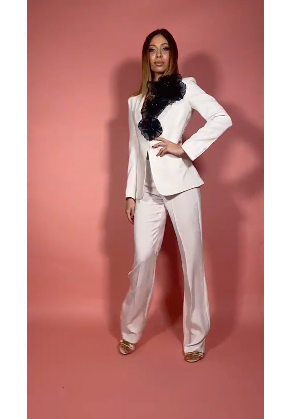 Un pantalone classico Fabiana Ferri, a gamba dritta, da poter sfruttare in completo con la giacca in tinta e con tantissimi top a contrasto. E che ne pensi di un total white illuminato dai giusti gioielli?