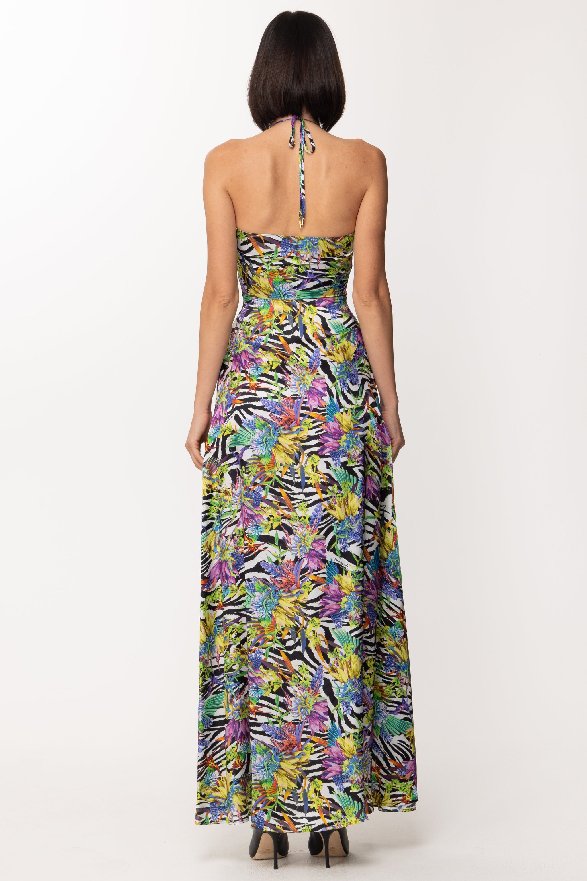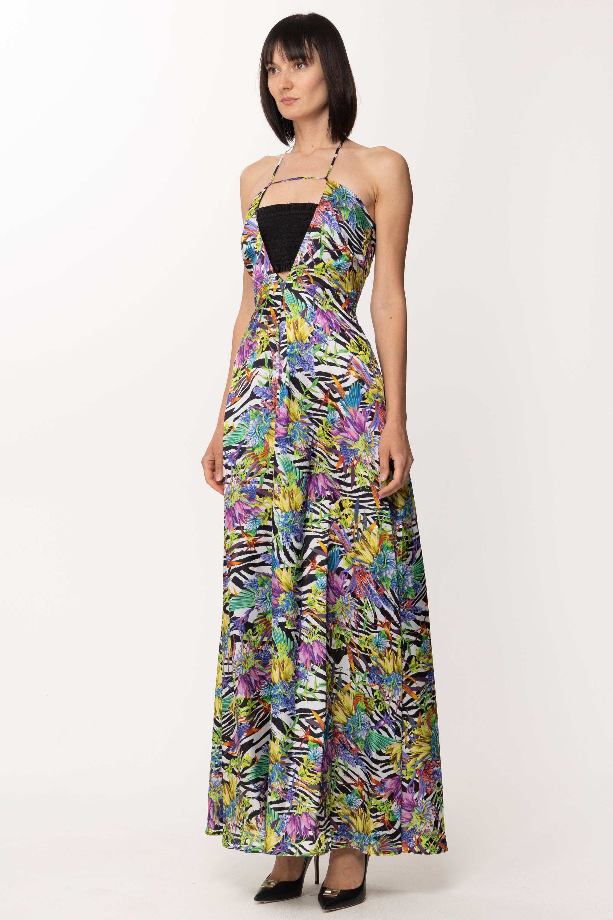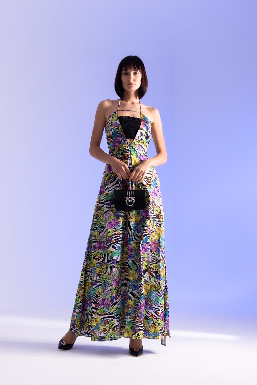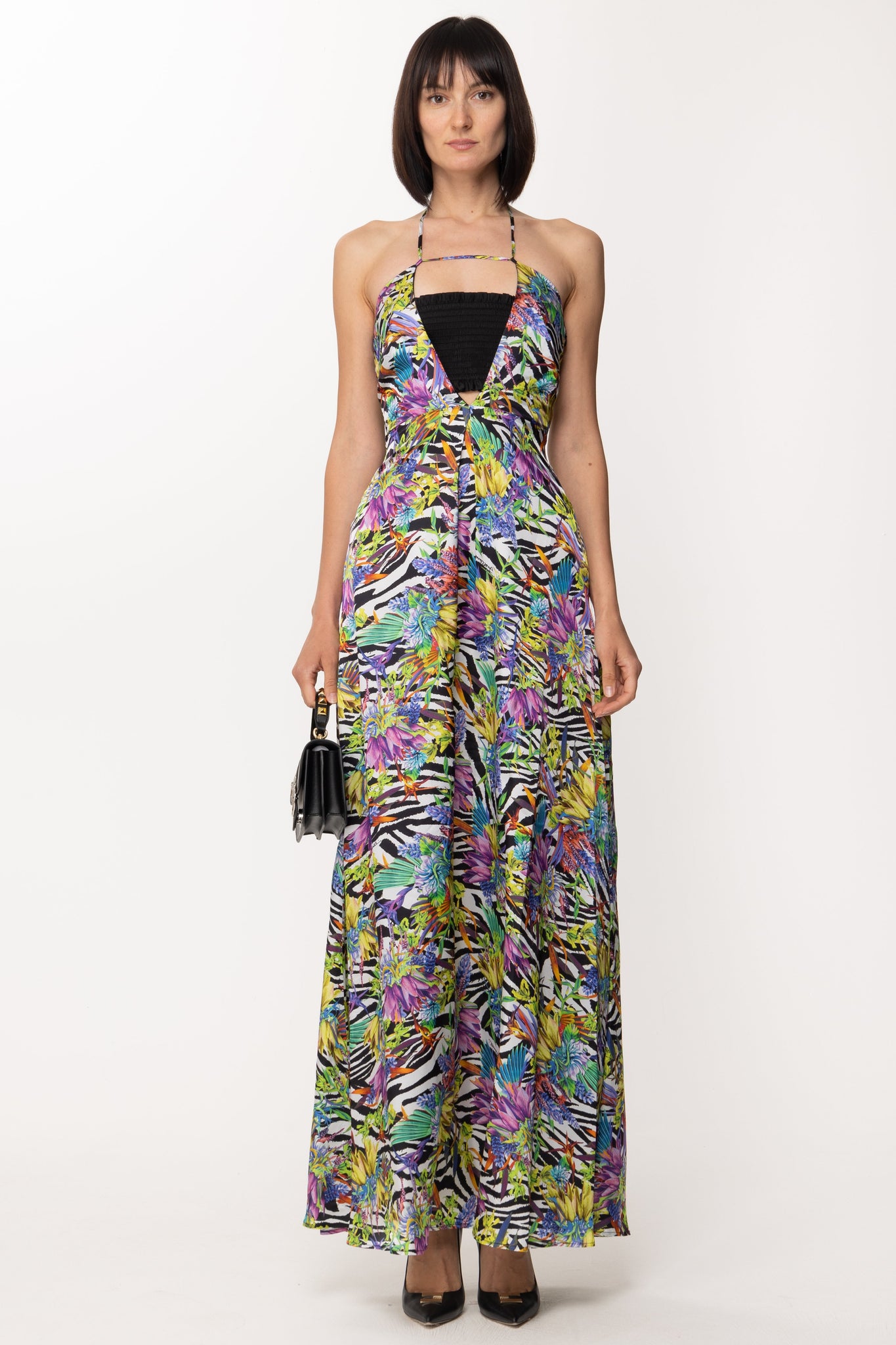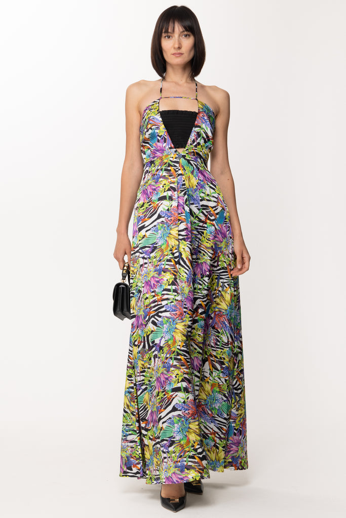 Non manca di originalità la stampa di questo abito lungo Just Cavalli, che sovrappone un motivo floreale coloratissimo ad un pattern zebrato. Aderente al punto vita e ampio lungo le gambe, la parte si apre su un inserto nero arricciato che privilegia il seno aggiungendo charme al tuo outfit. Scarpe con tacco o senza? Sta bene con entrambe le scelte, segui il tuo mood!