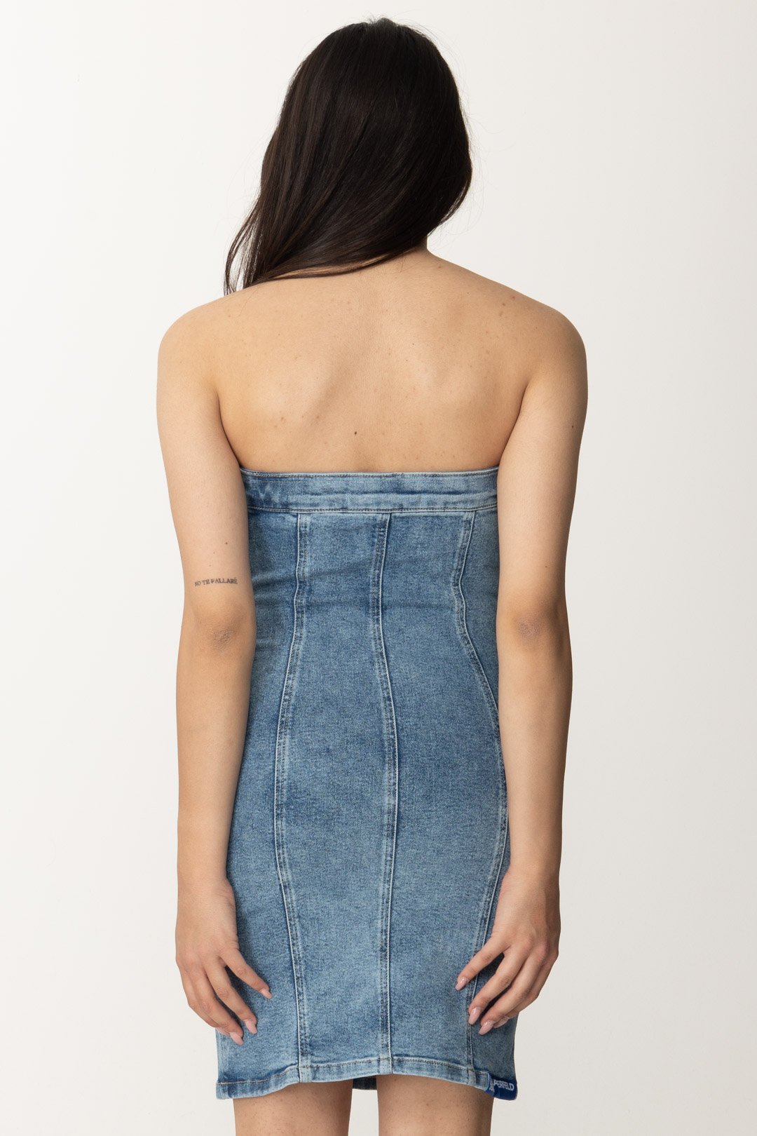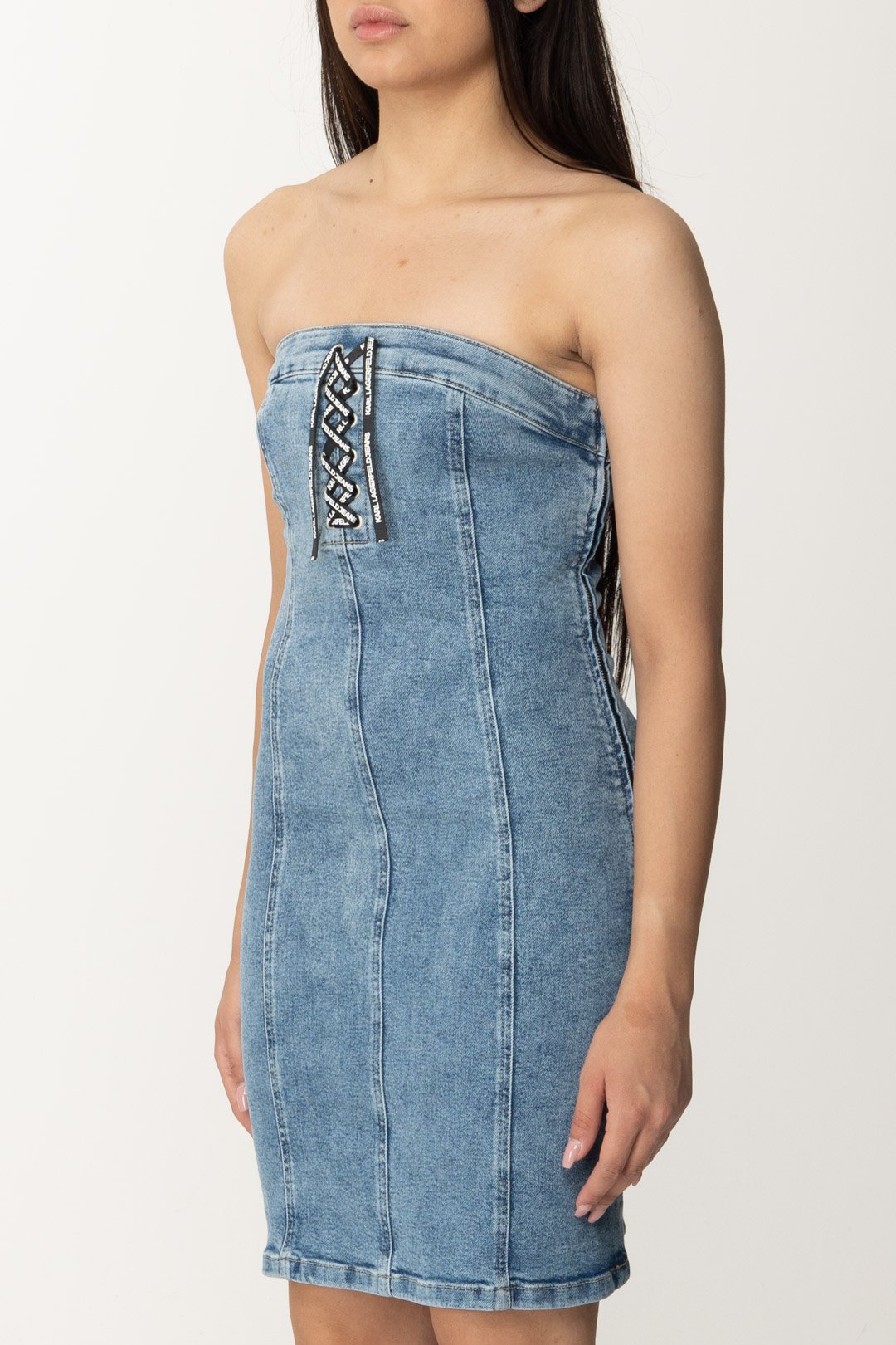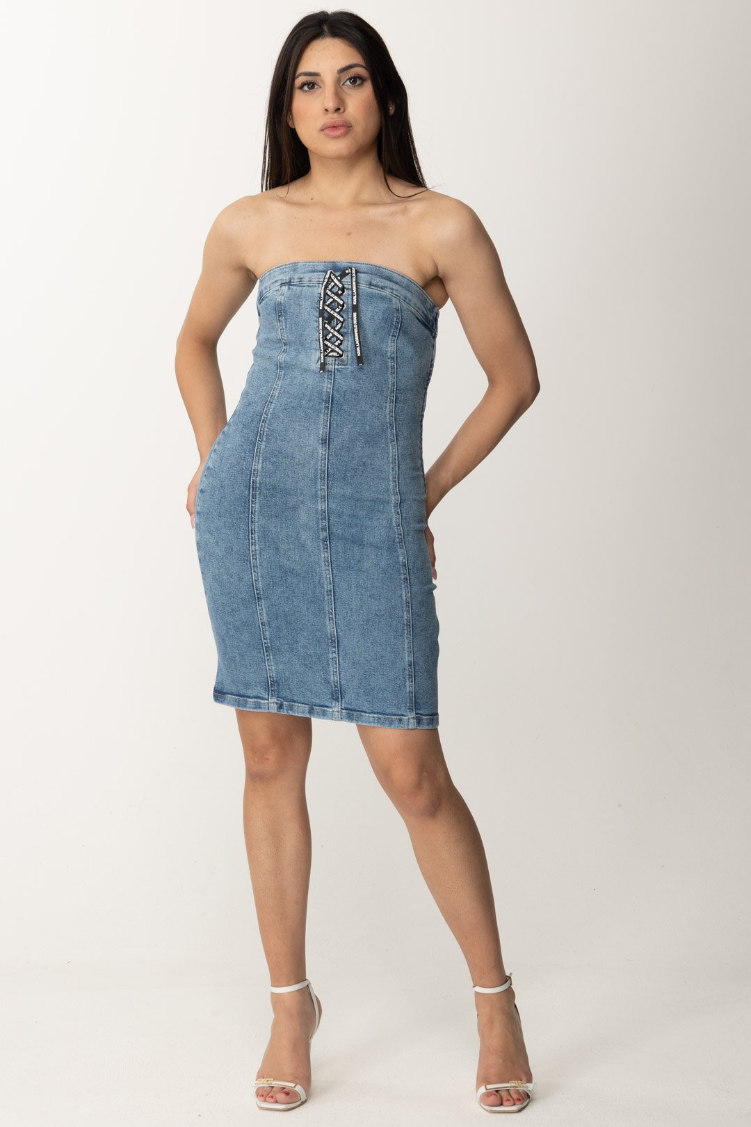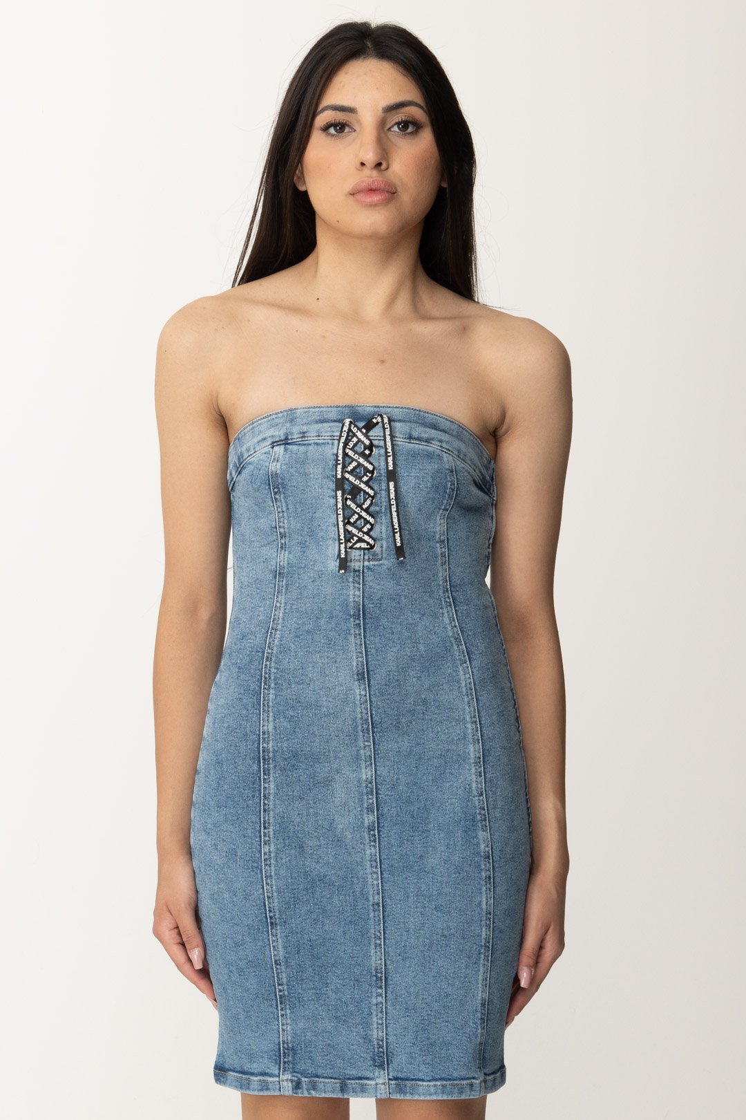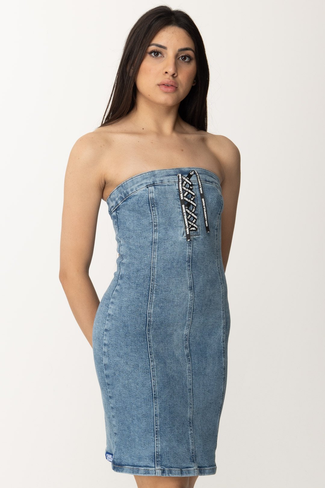 Il mini abito Karl Lagerfeld in denim è un classico rivisitato in chiave contemporanea. La silhouette aderente e il design senza spalline esaltano la femminilità, mentre i lacci a contrasto logati sul davanti aggiungono un tocco sportivo-chic. Un capo versatile e di tendenza per look casual o più audaci.