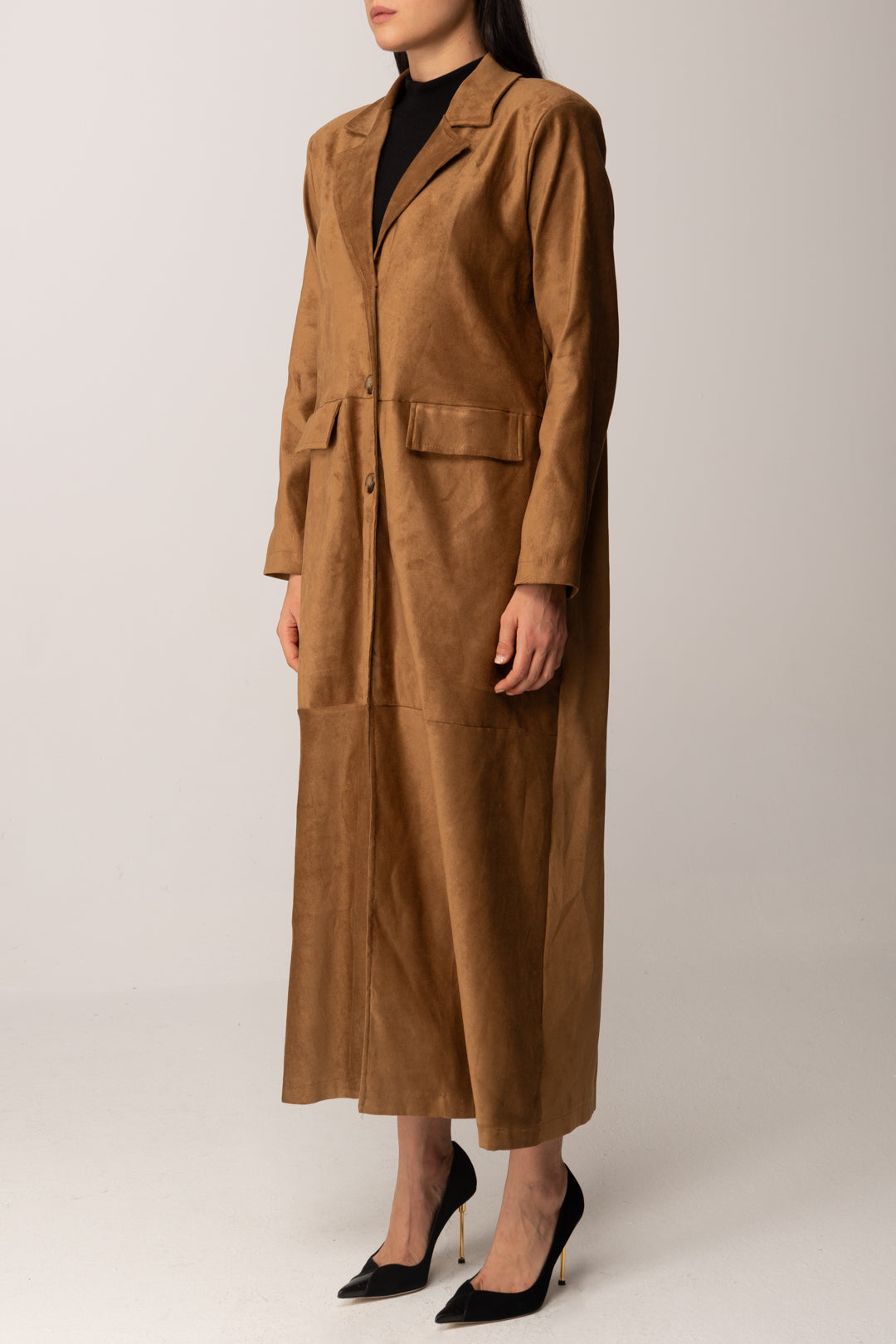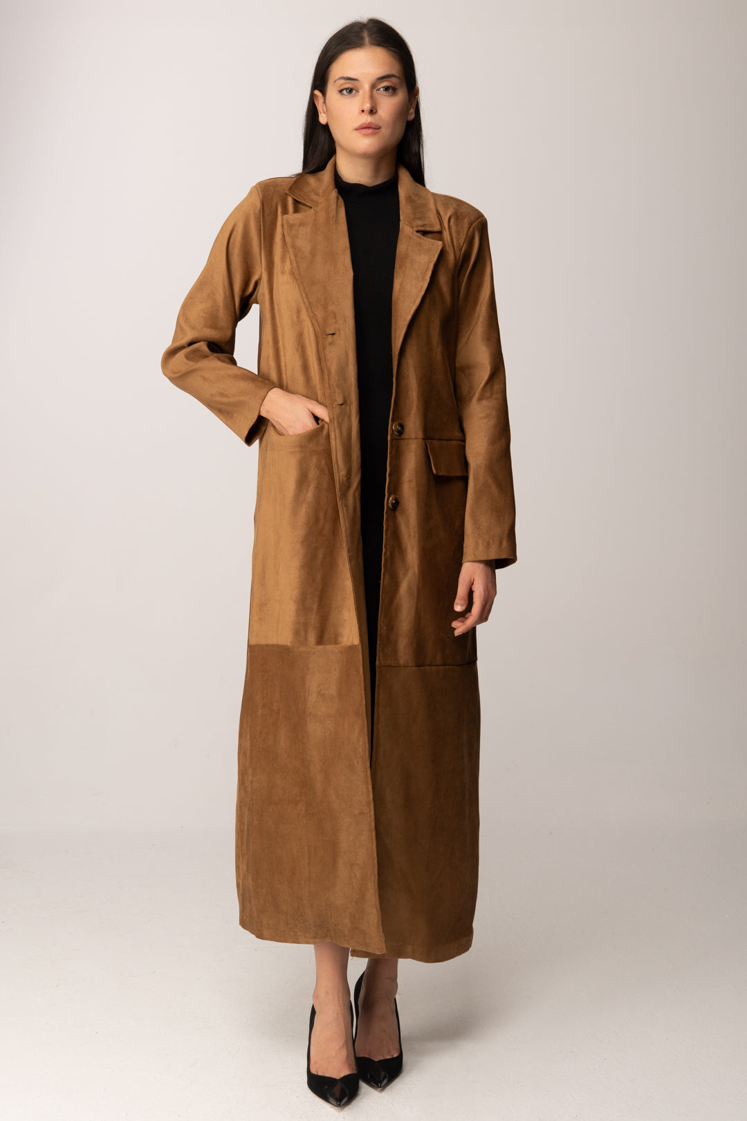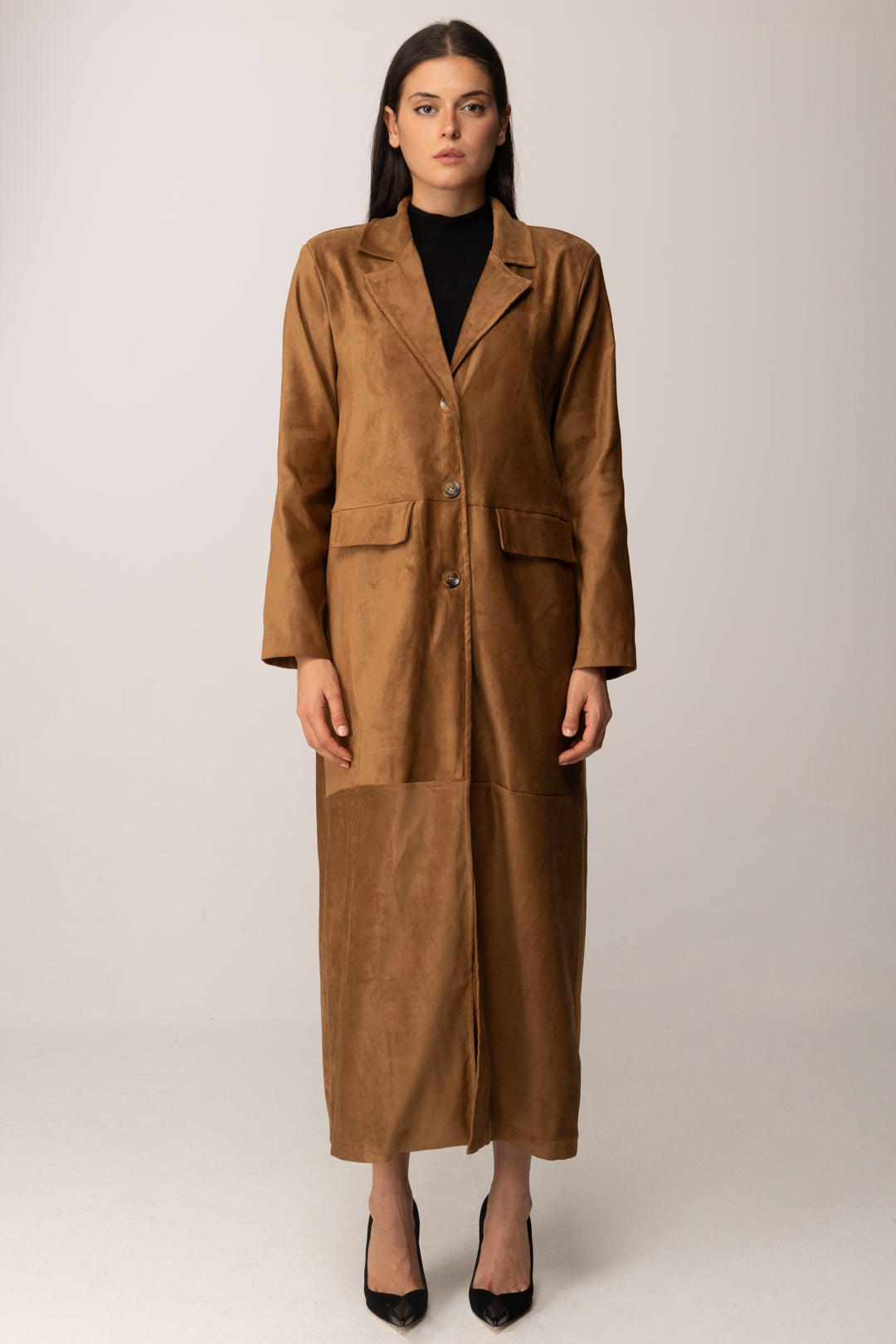 Stile deciso ed evergreen per questo cappotto Khloefemme in effetto suede, perfetto per affrontare con personalità le mezze stagioni. La linea allungata e pulita valorizza la verticalità della figura, mentre la texture morbida al tatto dona una sensazione di comfort avvolgente. Il design essenziale mette in risalto i dettagli sartoriali: il rever classico, la chiusura a bottoni frontale e le tasche applicate regalano funzionalità senza rinunciare all’eleganza. La lunghezza maxi crea un’allure sofisticata, ideale per slanciare la silhouette e completare look da giorno e da sera con un tocco più ricercato.