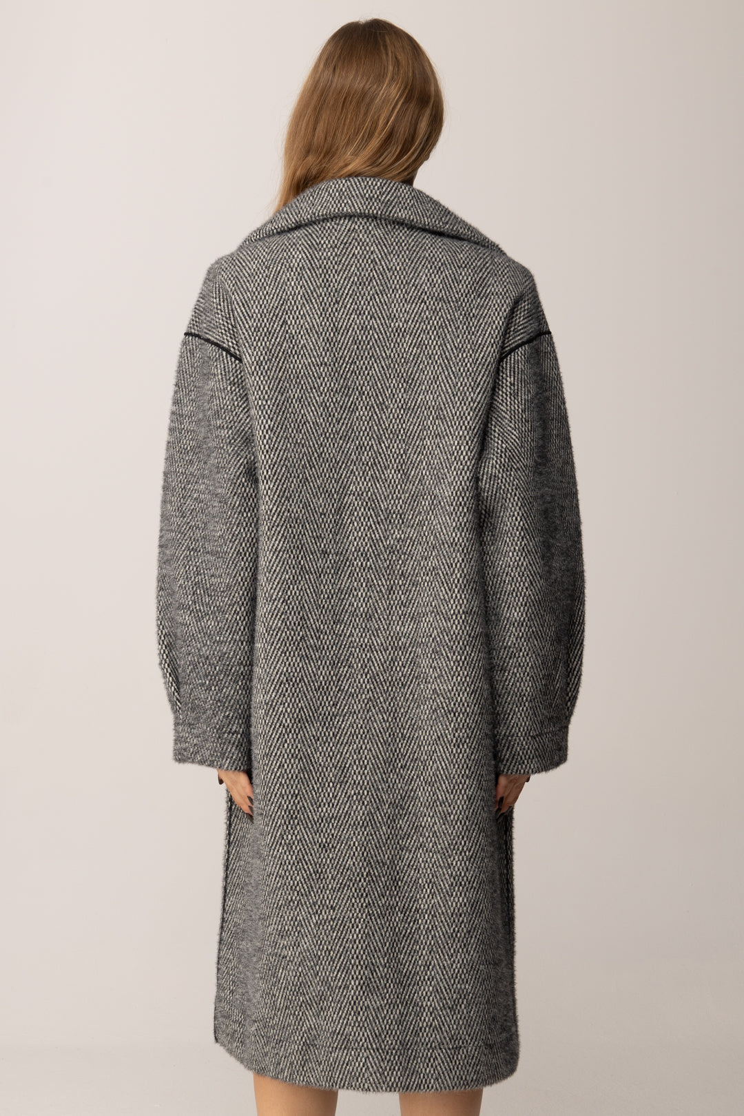 Attraversa l'inverno con carattere, presenza scenica e, a sorpresa, versatilità raddoppiata: grazie a questo cappotto Khloè Femme double face. Già al primo sguardo il tessuto spinato del lato fronte racconta un’attitudine raffinata, quasi metropolitana: i volumi sono ampi, le spalle leggermente scese, la linea scivola dritta senza mai perdere struttura. Le maxi tasche in pelliccia sintetica aggiungono un dettaglio inatteso che spezza la trama e dona subito un tocco più ricercato e contemporaneo.