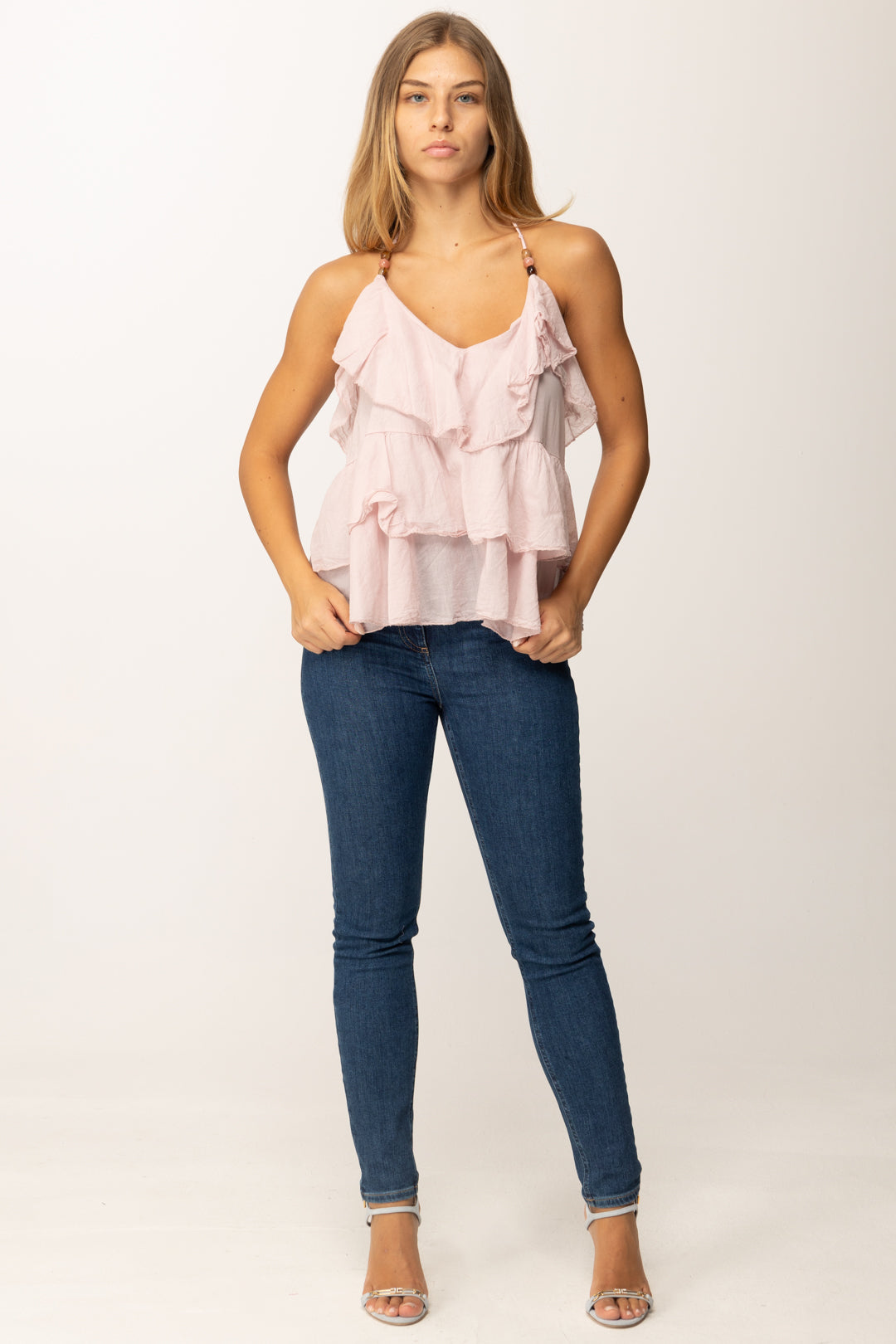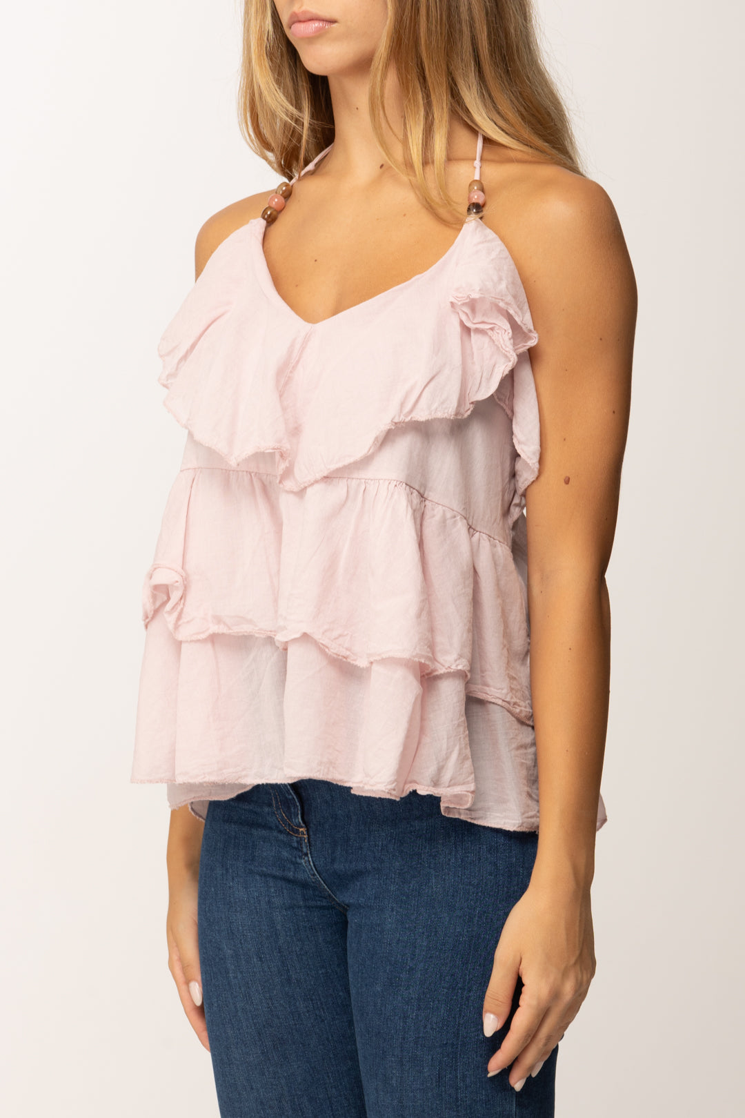 Sfizioso top Khloefemme dal design che non passa mai di moda: un susseguirsi di ampie balze, con scollatura morbida e da annodare al collo, con perline colorate ornamentali a decorazione dei laccetti. La schiena presenta un'ampia scollatura, perfetta per l'estate e per mettere in mostra l'abbronzatura, già gratificata dalle tinte pastello in cui viene proposto il capo, perfette per creare un contrasto di colori con la carnagione.