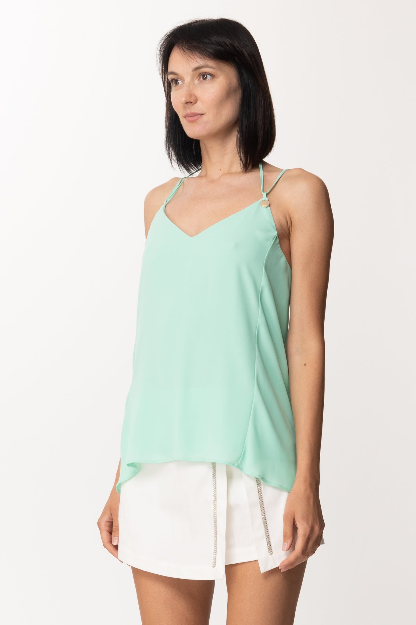 Top Mangano fluido e leggero, da poter utilizzare con svariati outfit, dal casual all'elegante grazie alla sua versatilità. Le bretelle sottili diventano parte integrante della scollatura a v sul fronte per accentuare l'attenzione sul decollete!