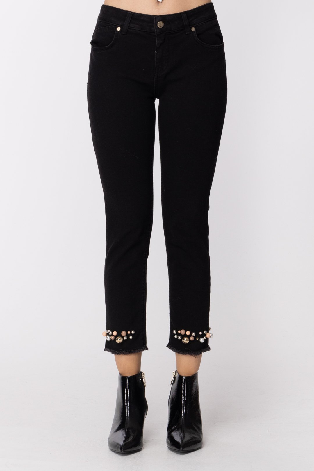 Pantaloni Manila Grace dalla vestibilità skinny non del tutto convenzionali. Perchè? Grazie all'applicazione di perle di varie dimensioni sul fondo e agli orli sfrangiati, che gli danno un'aria sbarazzina ma esclusiva insieme.