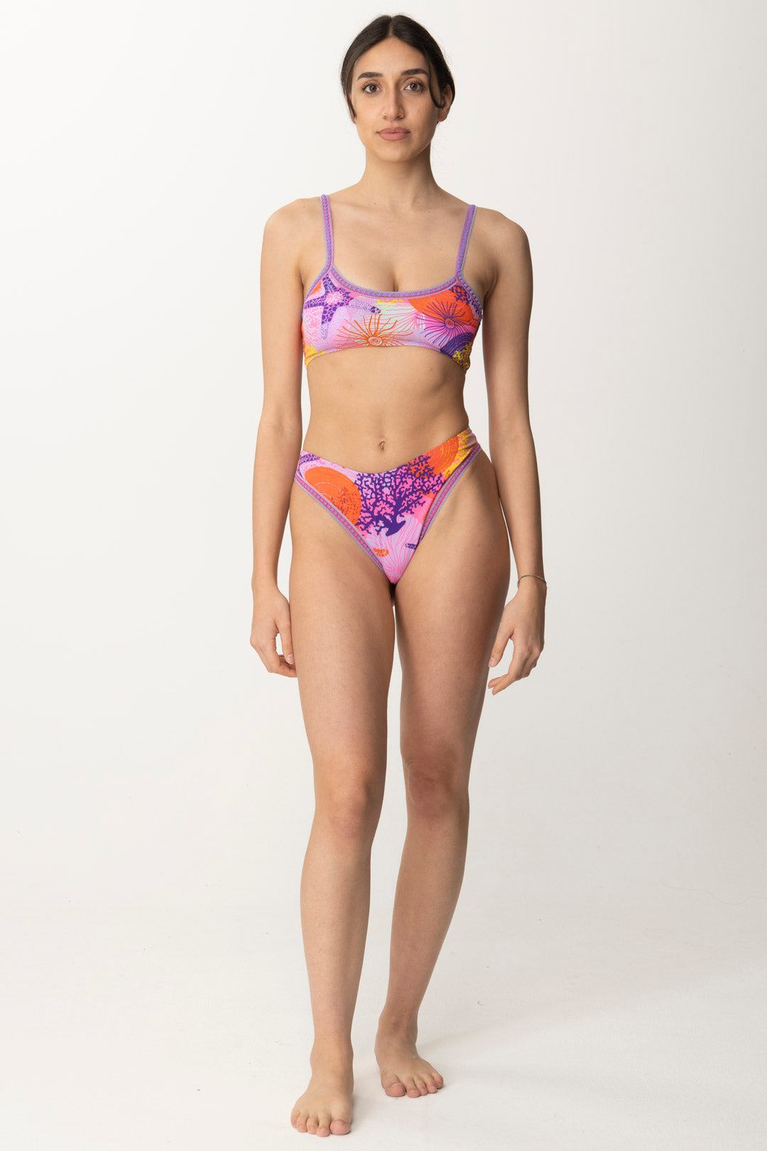 Fantasiosa stampa a tema fondale marino proposta a tinte sgargianti per questo bikini Me fui. Sia il top che lo slip americano fisso sono bordati di passamaneria colorata: un tocco imprevedibile, a constrasto con la sua vivacità.