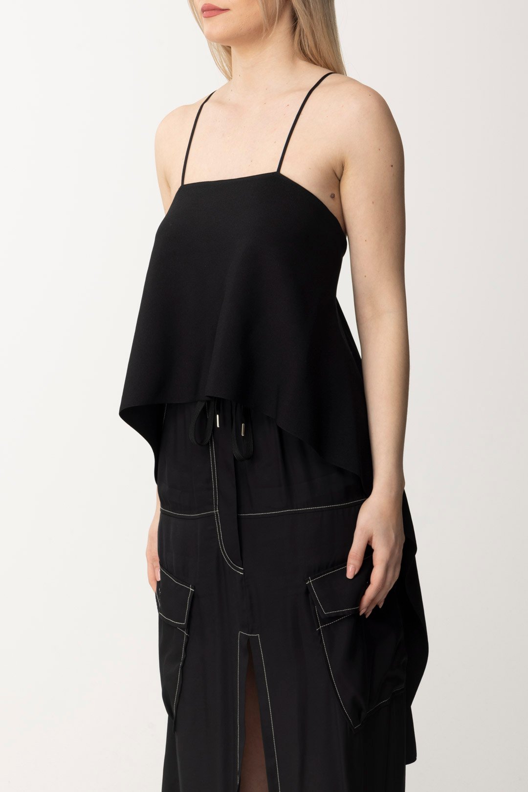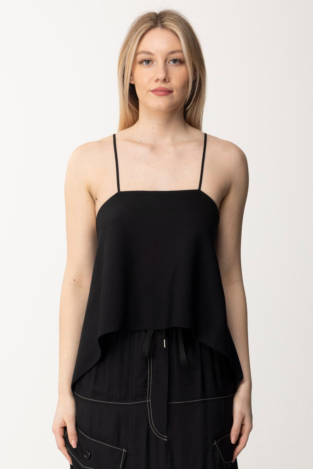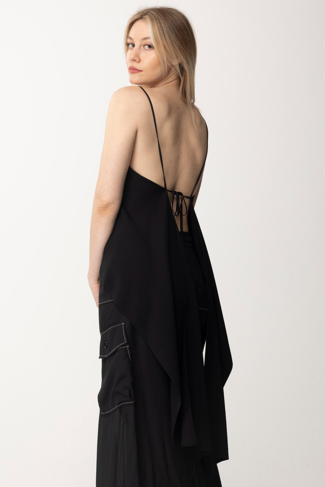 Top Semicouture tra i più belli da indossare per questa stagione: de il fronte si allunga ai lati creando un gioco effetto volant, il retro è lasciato interamente scoperto, eccezion fatta per i due nastrini che ne costituiscono l'allacciatura. Bellissimo con i jeans, bellissimo con qualsiasi altro bottom più elegante per un look femminile quanto imprevedibile.