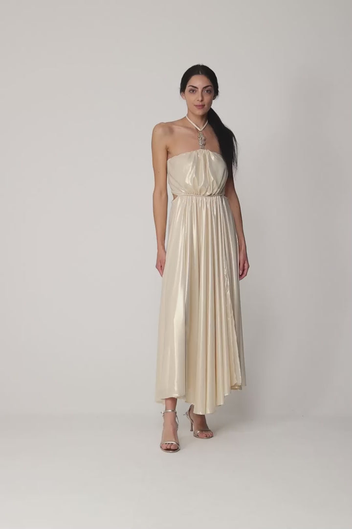 Elegante ed originale questo abito Simona Corsellini: modello dal taglio lungo e vestibilità scivolata, realizzato in tessuto spalmato che dona incredibile lucentezza al capo. Si caratterizza per la sua scollatura a fascia sorretta da un ciondolo metallico e da un'allacciatura attorno al collo, cut out ai lati lungo il punto vita e fondo asimmetrico. Con un bel paio di sandali con tacco e una clutch coordinata sarai pronta per le tue occasioni più importanti.