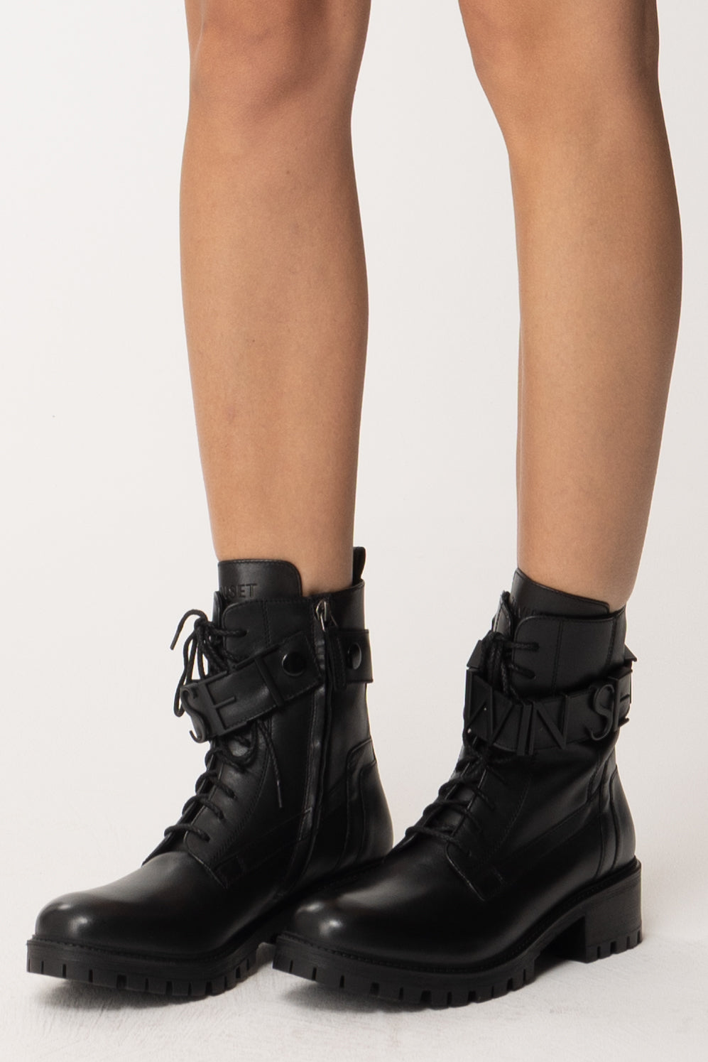 Il tuo urban wear si arricchisce di un paio di anfibi Twin Set, punto di incontro tra stile e praticità. Altezza alla caviglia, con fascia che riproduce il logo, si indossano con facilità grazie alla chiusura con zip laterale, nascosta nel lato interno. Con cosa li vediamo bene? Con abiti lunghi e svolazzanti stile boho, ma anche con capi grintosi in pelle e jeans skinny.Altezza: 4,5 cm100% PelleSuola in gomma