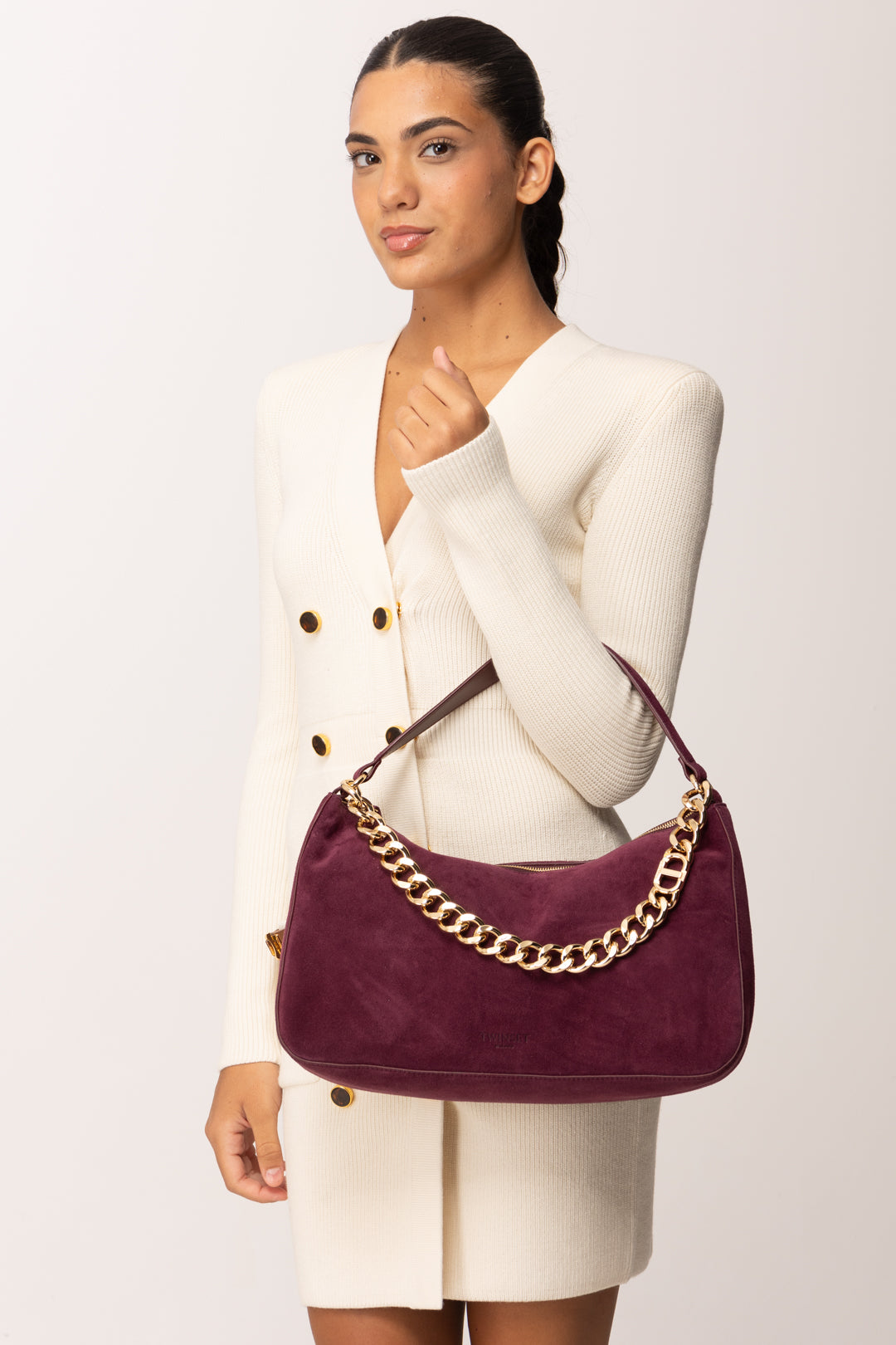 Morbidezza e carattere si incontrano nella borsa ‘Liliane’ Twinset versione media, un accessorio che parla di femminilità urbana e dettagli sofisticati. Realizzata in suede marrone caldo, il design a mezza luna è valorizzato da una maxi catena dorata che funge da manico decorativo o tracolla glamour.Il gioco tra le texture la pelle scamosciata opaca e il metallo lucido crea un look di contrasto sofisticato e ricercato. L’interno, foderato e dotato di tasche, accoglie l’essenziale con ordine.